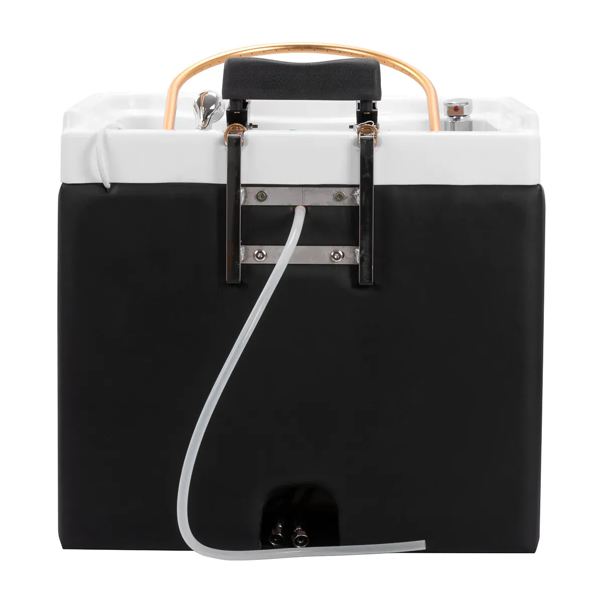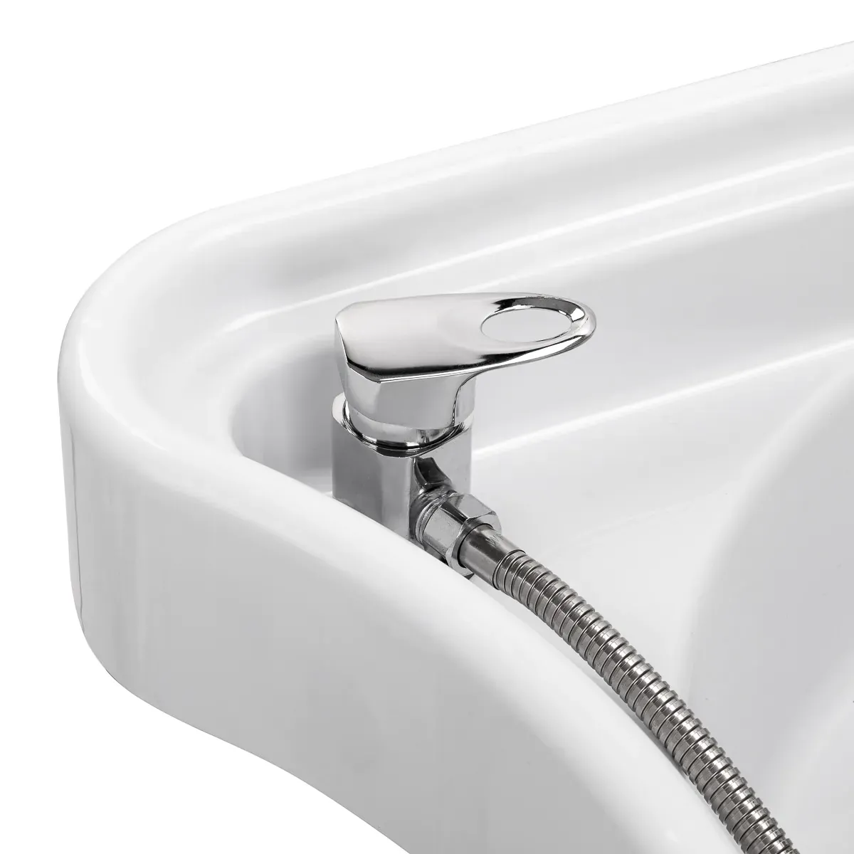 La vasca profonda in eleganti tonalità di bianco è progettata per garantire il massimo comfort sia al cliente che all’operatore. La sua forma evita efficacemente schizzi d’acqua e di prodotti cosmetici, facilitando la pulizia e mantenendo l’area di lavoro sempre ordinata.