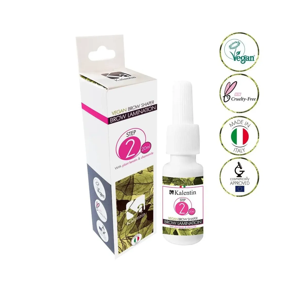 - Kalentin Brow Shaper Vegano rappresenta la seconda fase della procedura di laminazione sopracciglia. Questo prodotto rompe delicatamente i legami delle sopracciglia, permettendo così di ridefinirne la forma. Allo stesso tempo la cheratina e la camomilla esercitano un effetto ristrutturante e rigenerante. Per rimuovere il prodotto utilizzare un pennello in cotone oppure un micro pennello asciutto, non utilizzare acqua.