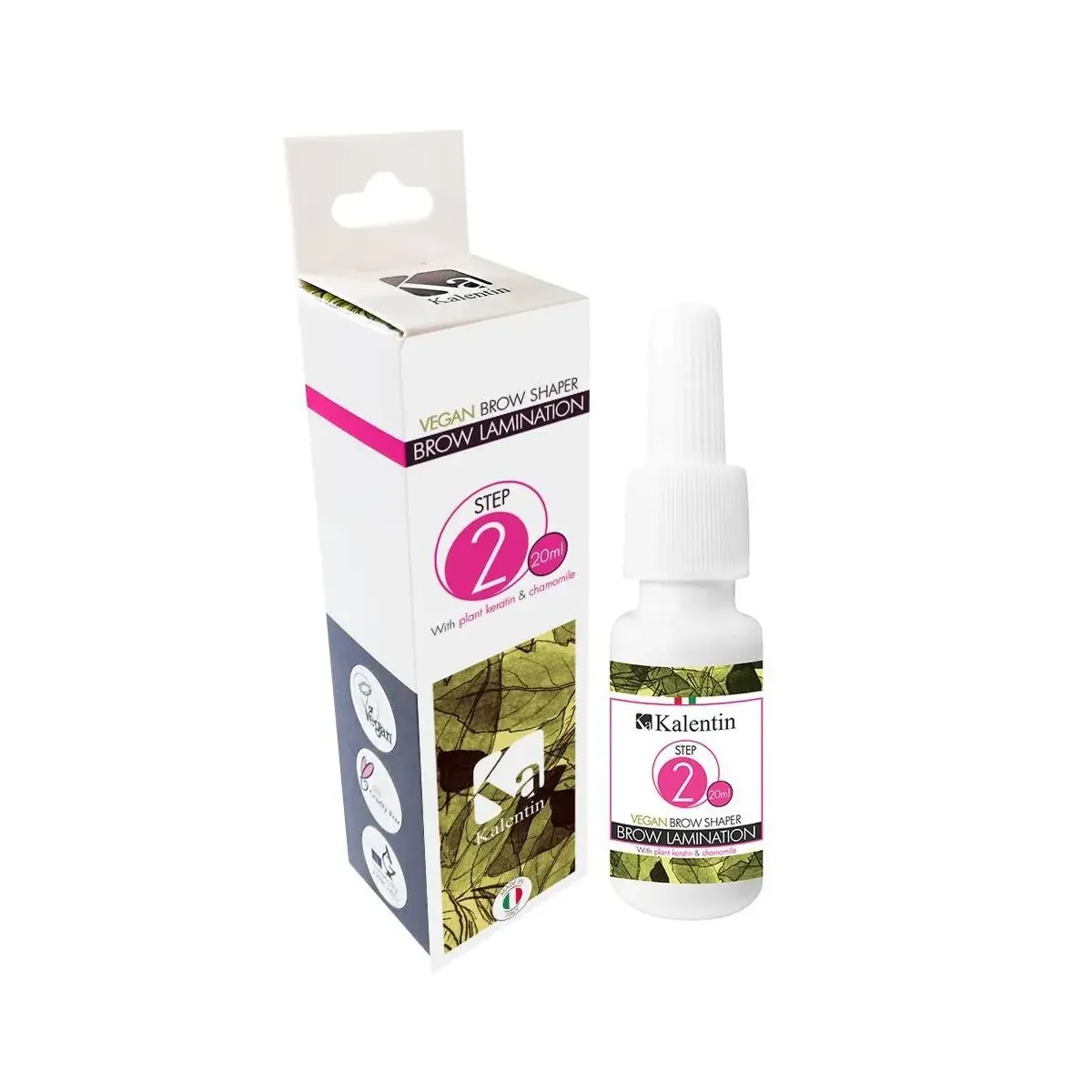 Brow Kalentin Vegano rappresenta la seconda fase della procedura di laminazione sopracciglia. Questo prodotto rompe delicatamente i legami delle sopracciglia, permettendo così di ridefinirne la forma. Allo stesso tempo la cheratina e la camomilla esercitano un effetto ristrutturante e rigenerante.