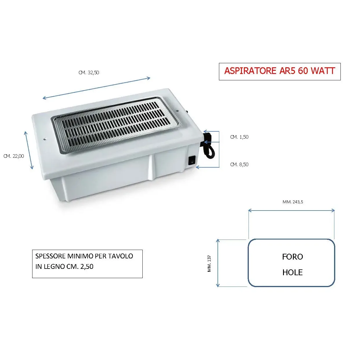 Aspiratore Unghie da incasso per tavolo manicure con potente motore da 60 watt dal giusto compromesso tra rumorosità ed aspirazione, filtro estraibile a carboni attivi per un totale trattenimento delle polveri (da pulire dopo ogni operazione per una perfetta funzione aspirante, non usare acqua o liquidi, basta picchiettarlo delicatamente). Completo di cavo di alimentazione, interruttore acceso/spento e griglia copri-foro in ABS per il tavolo.