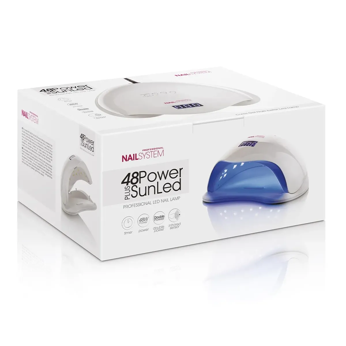 Il modello 48 Power Plus Sun Led è una lampada professionale a 36 led dotata di sistema ad infrarossi che attiva e disattiva l’apparecchio con sistema automatico all’inserimento o all’estrazione della mano. Garantisce alte prestazioni professionali e riduce i tempi di cottura con il sistema a doppia potenza attivabile dal pannello comandi. La base può essere separata dal corpo per eseguire trattamenti gel su piedi.