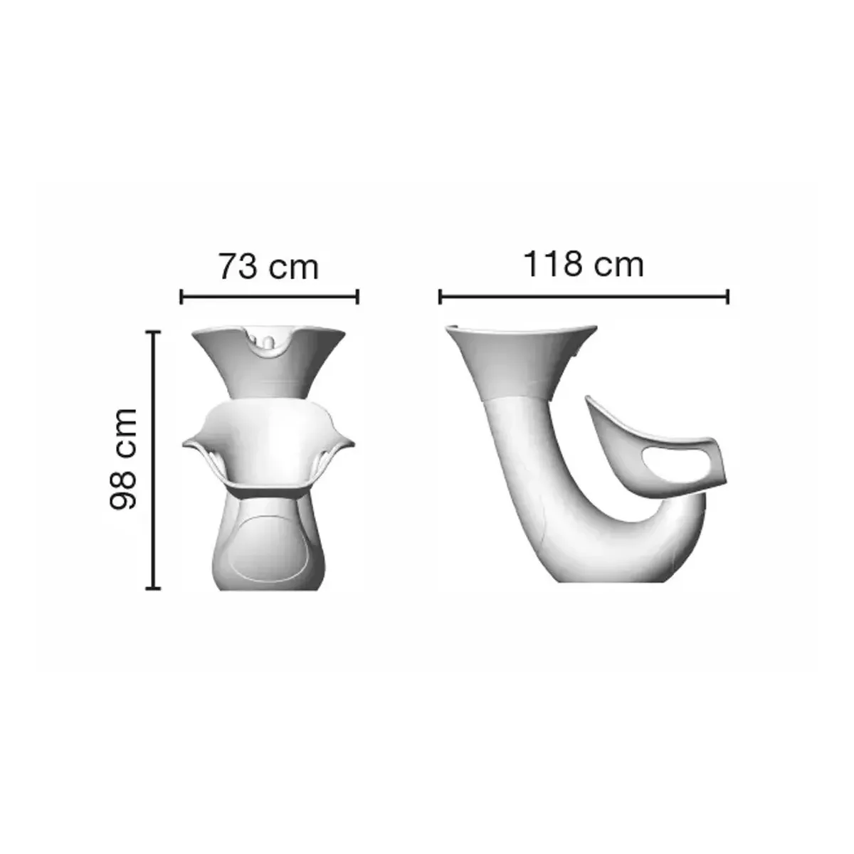 Scocca in poliuretano schiumato con doppio inserto in poliuretano rigido. Struttura in alluminio pressofuso. Lavabo in porcellana oscillante con snodo regolabile.