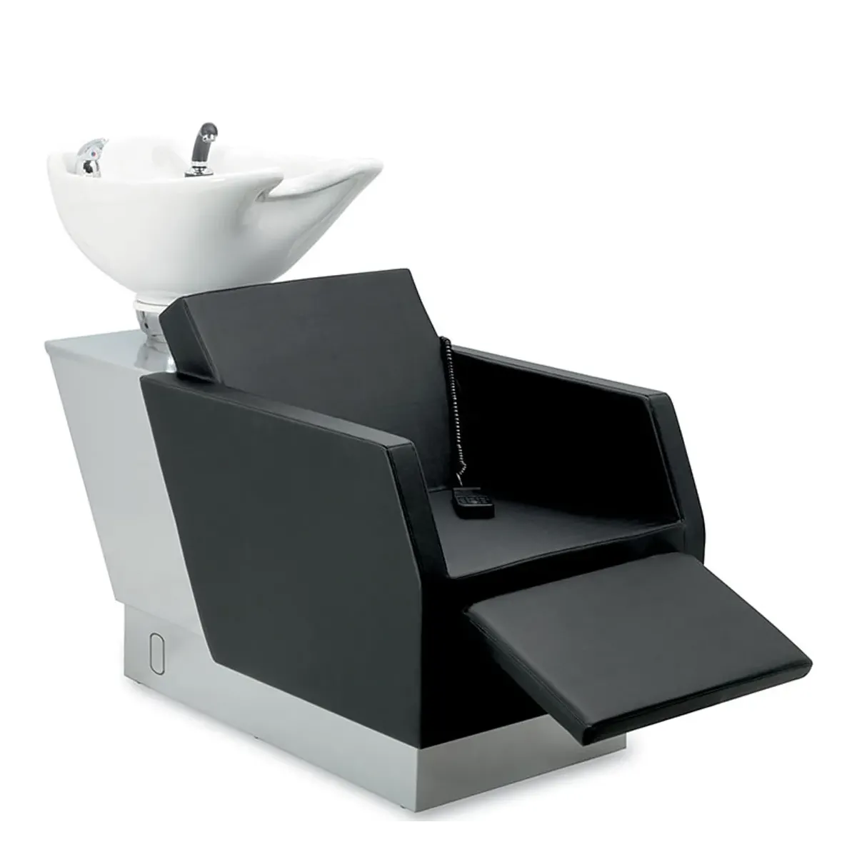 Postazione lavaggio con seduta, schienale e braccioli imbottiti e rivestiti in Skay. Lavandino in ceramica smaltata regolabile in altezza. Poggiapiedi elettrico per offrire il massimo comfort ai clienti.