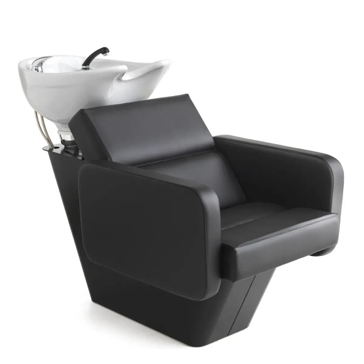 Postazione lavaggio dalle forme eleganti e confortevoli. Seduta e schienale extra comodi grazie all'imbottitura dall'alto spessore, anche i braccioli son imbottiti per donare ancora più confort al cliente. Lavabo basculante in ceramica nera.