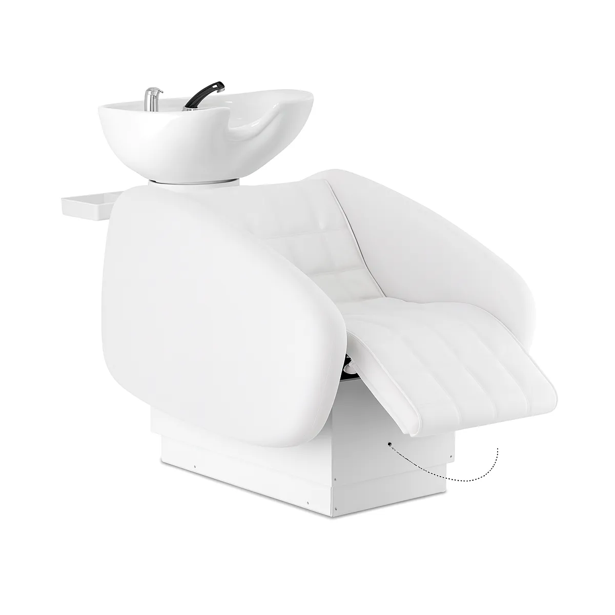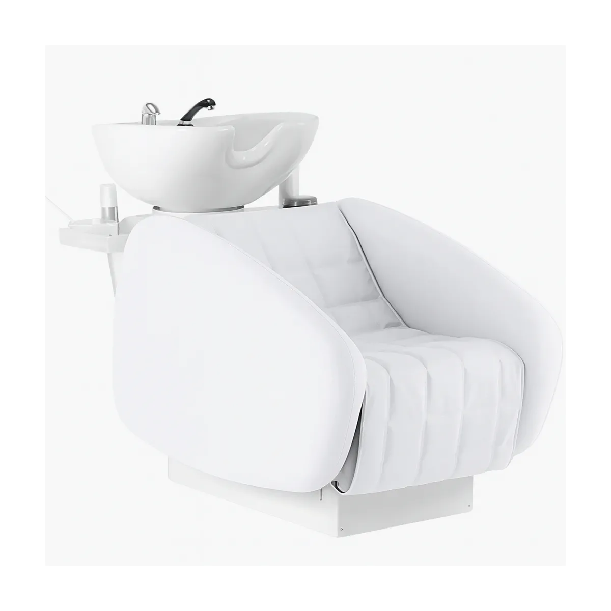 La poltrona lavatesta essendo molto ampia offre una seduta confortevole, è possibile anche scegliere il lavatesta Suite con alzagambe elettrico per offrire un servizio di puro relax al cliente oltre allo shampoo. Infine il lavaggio è compreso di vasca in ceramica basculante di colore nero o bianco, lateralmente presenta anche dei comodi vassoi per agevolarvi, infine è completo di doccetta con miscelatore.