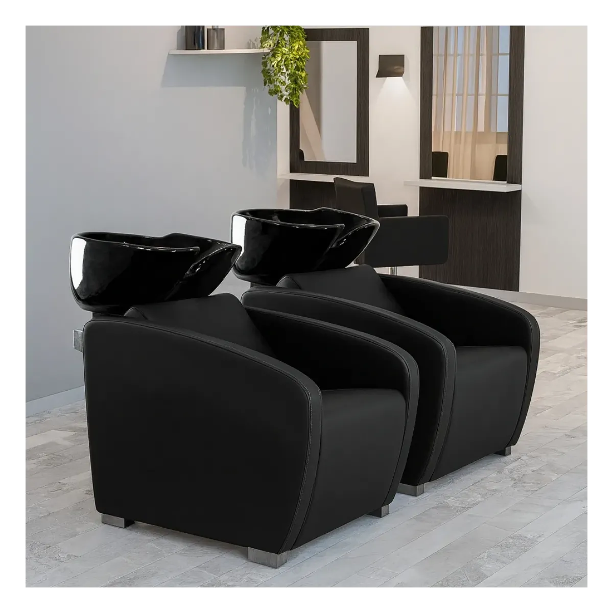 2 Lavaggi Parrucchieri Professionali dal design moderno e con forme arrotondate, ideali per arredare un salone parrucchiere oppure un barber shop. La struttura è fatta in legno e acciaio ed è totalmente imbottita e rivestita in sky ecopelle nero, la seduta è profonda e garantisce al cliente un momento di puro relax oltre allo shampoo. Infine il lavaggi sono compresi di vasca in ceramica basculante di colore nero e sono completi di doccetta e miscelatore per acqua calda o fredda.