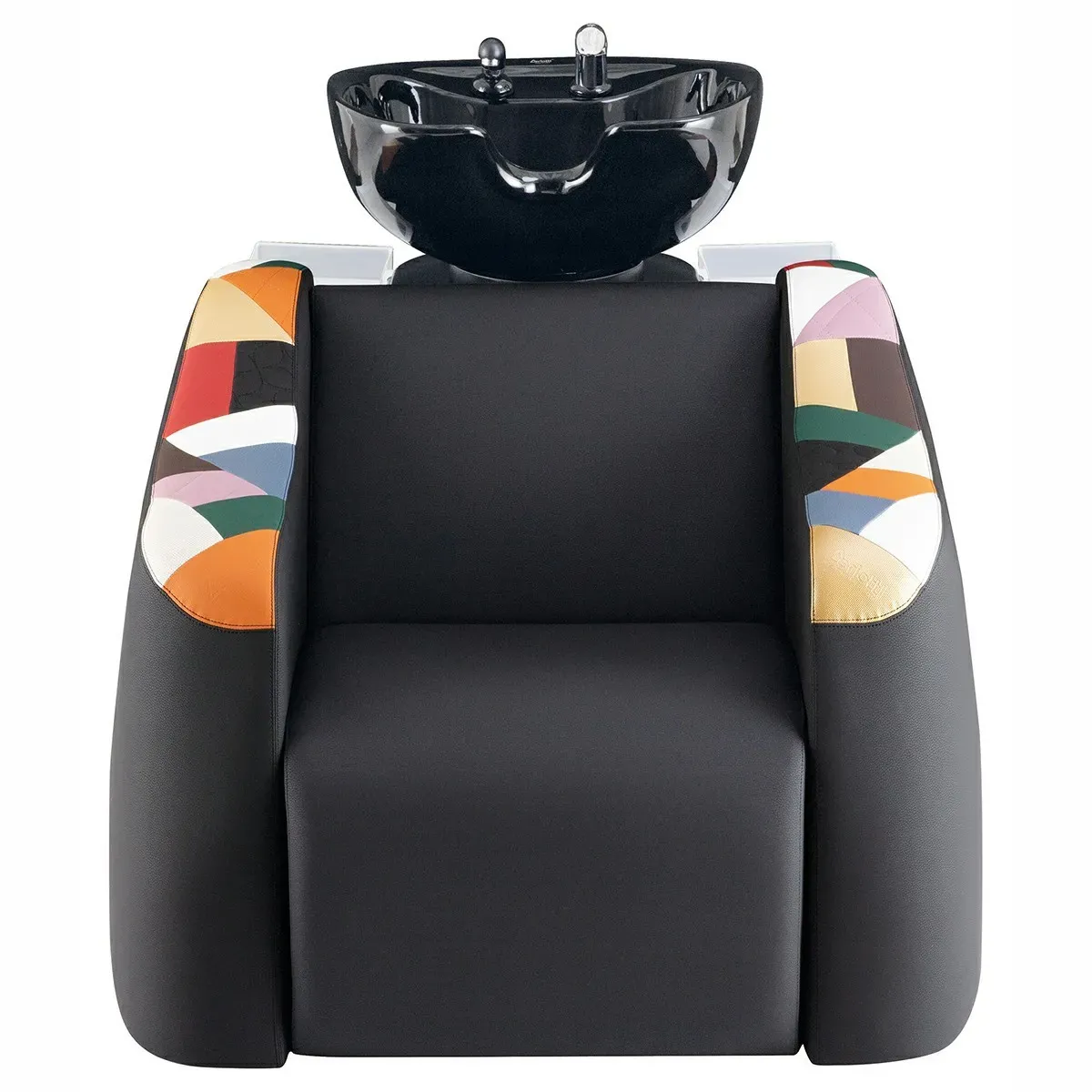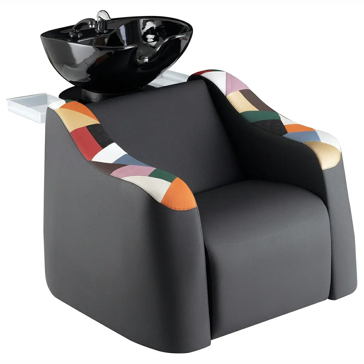 Il lavabo per parrucchieri Queen è fatto in legno con inserti in metallo che garantiscono robustezza e durata nel tempo, mentre il design elegante e moderno, arricchito con i braccioli con lavorazione colorata patchwork, si adatta perfettamente a qualsiasi arredamento parrucchieri.