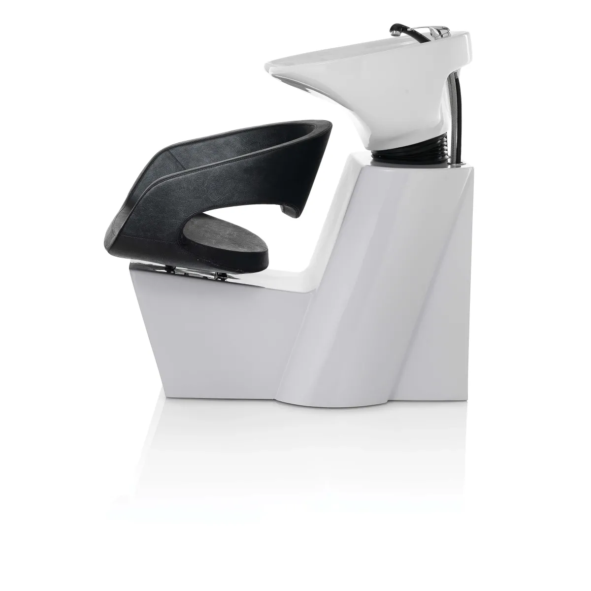 Poltrona lavatesta singolo con seduta in eco pelle di colore nero e vasca in ceramica bianca basculante completo di doccetta con tubo flessibile.