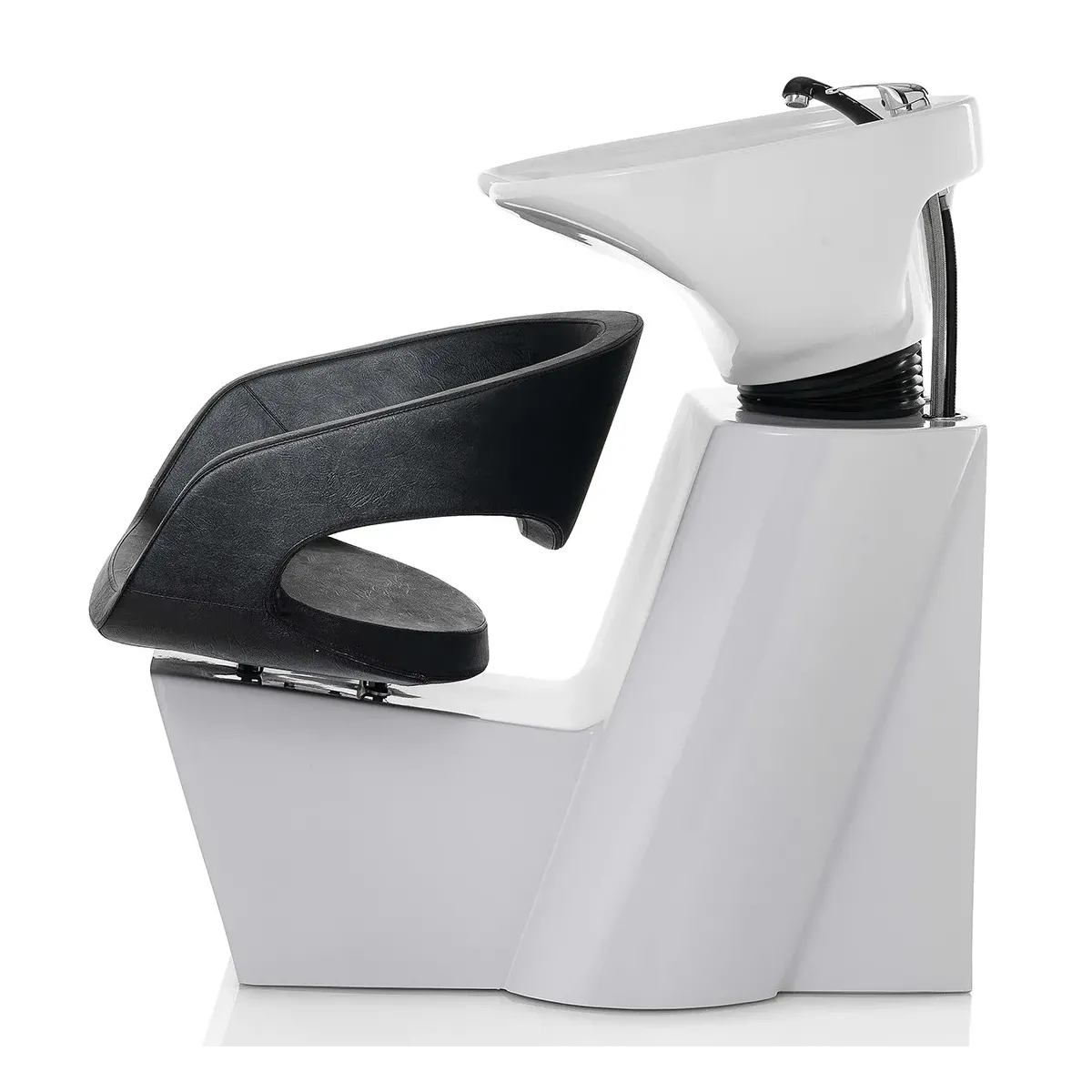 2 Lavaggi per Parrucchieri dal particolare design con forme arrotondate e vivaci. Struttura in acciaio riverniciato bianco, seduta e schienale con poltrona imbottita ad alta densità e rivestita in skai ecopelle di colore nero. La vasca è basculante in ceramica bianca ed è completa di doccetta con miscelatore e tubo flessibile. La struttura è realizzata in acciaio riverniciato di colore bianco, solido e resistente con una forma ad "L" che racchiude il serbatoio e sorregge la seduta.