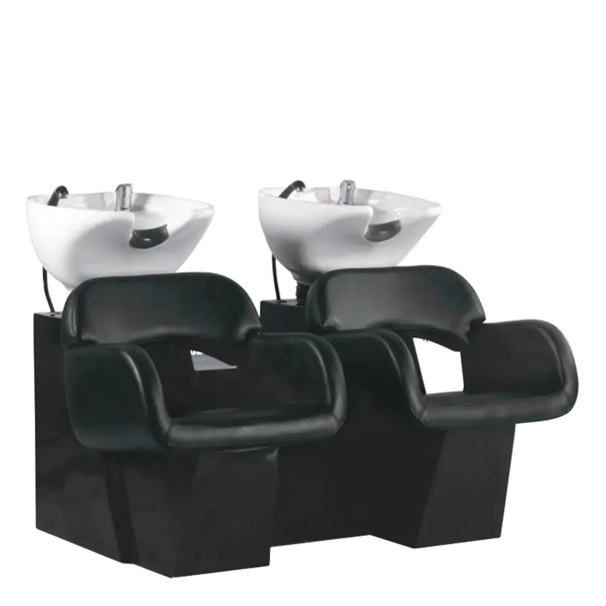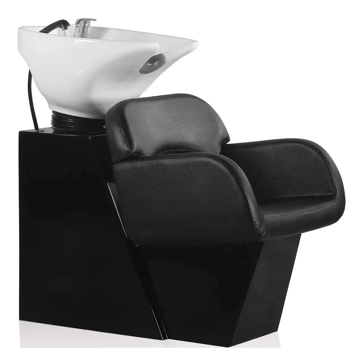La vasca del lavaggio parrucchiere posa su di una struttura in acciaio formata da un design a blocchi con verniciatura tra i colori bianco o nero. Sul lato anteriore è presente la seduta in monoscocca completa di braccioli con uno schienale formato da un'arcata all'altezza delle scapole per un maggiore comfort, ha un'imbottitura ad alta densità morbida e confortevole rivestita in sky ecopelle di colore nero.