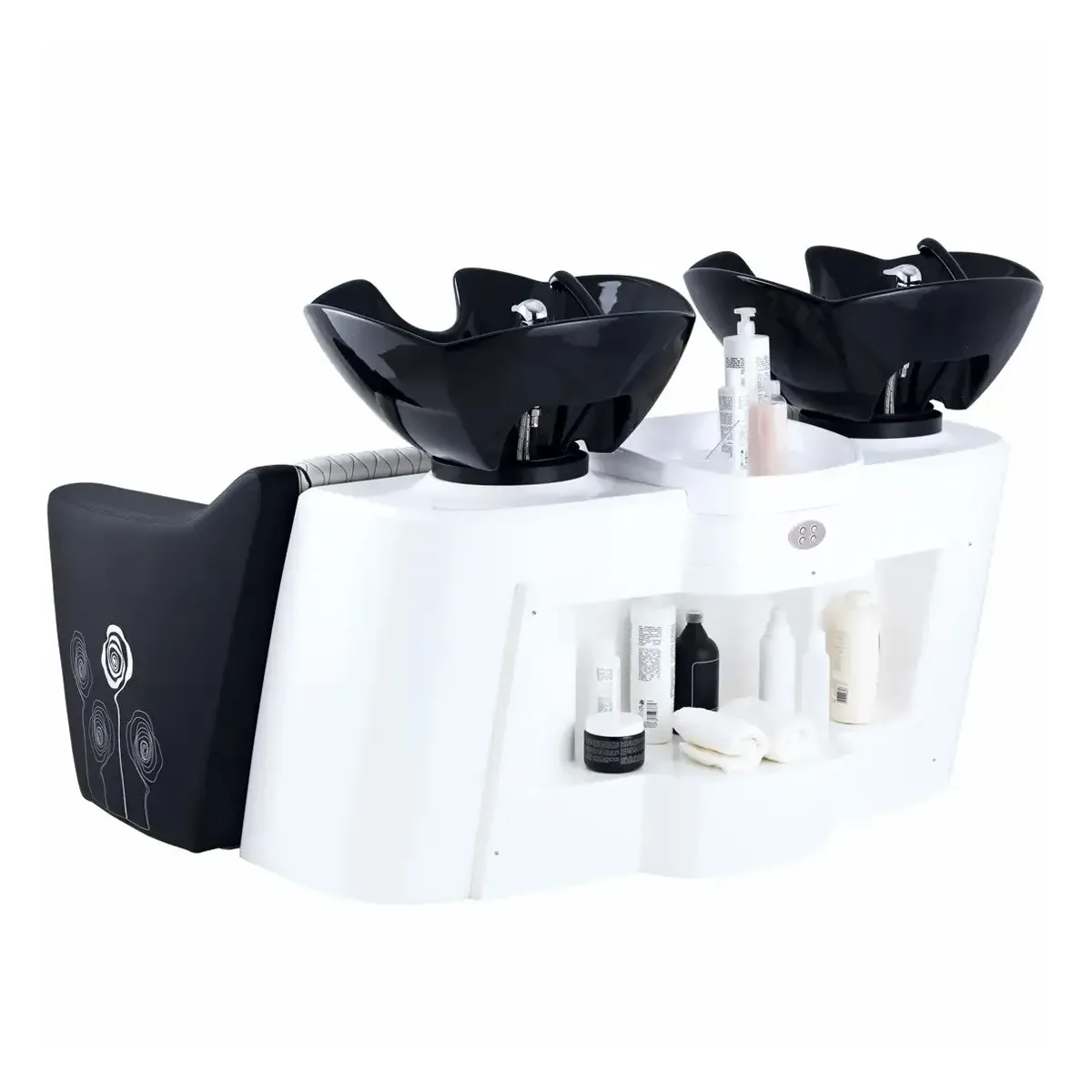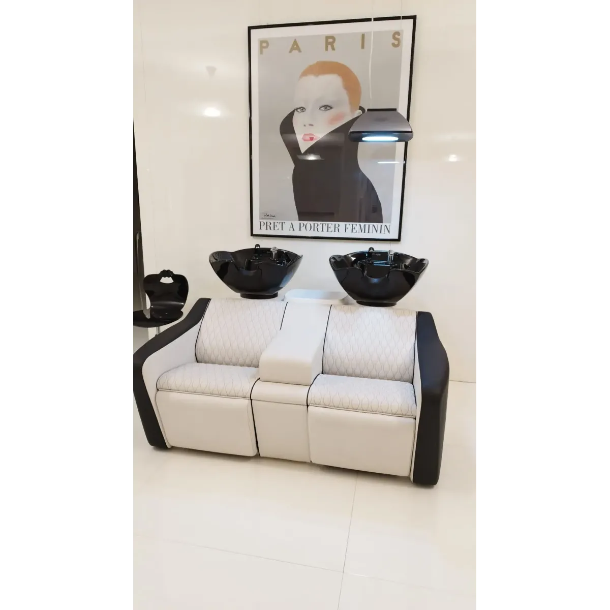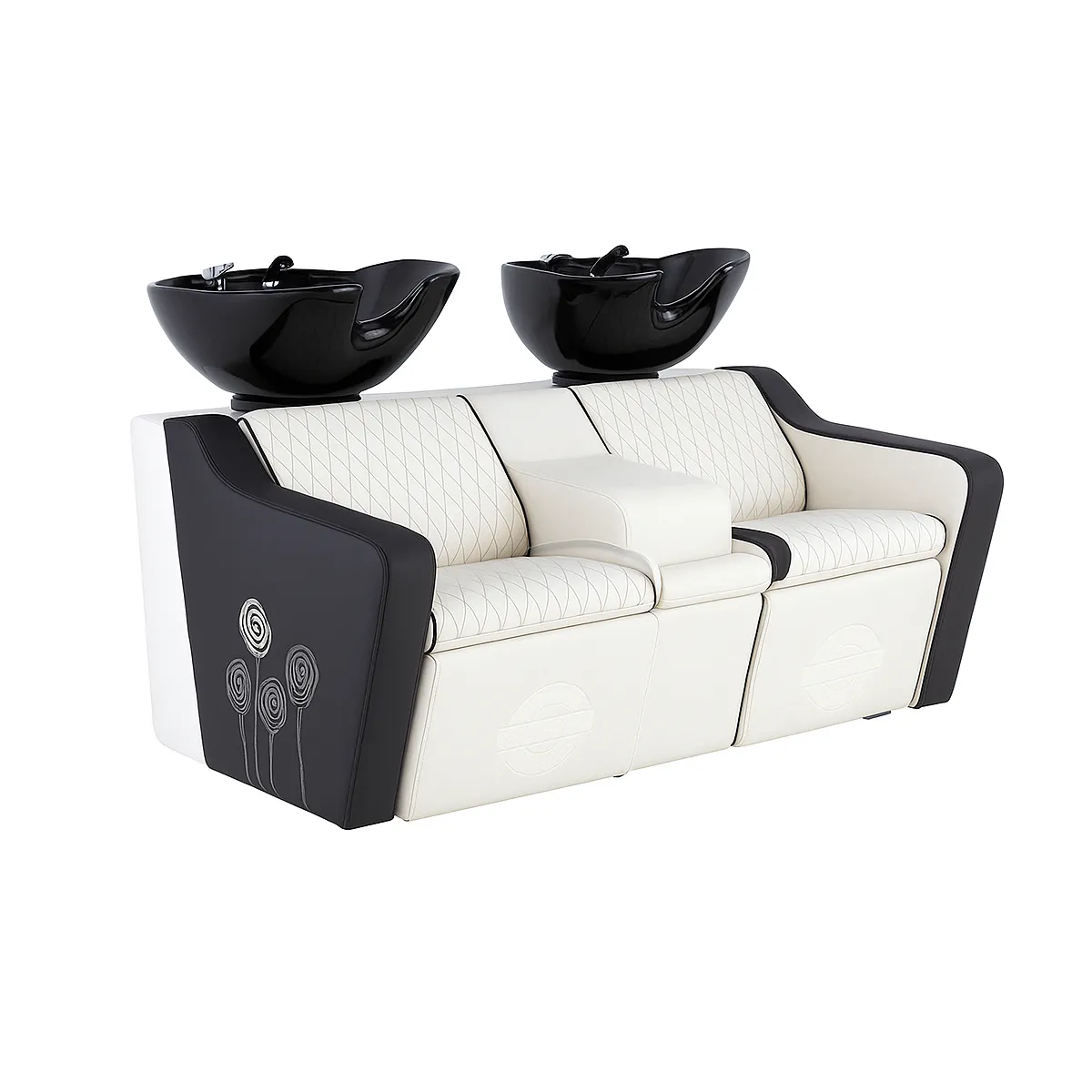 Le due ampie postazioni permettono di gestire contemporaneamente più clienti, ottimizzando i tempi di lavoro senza rinunciare alla comodità. Le sedute ergonomiche con imbottitura ad alta densità assicurano una posizione rilassata anche durante trattamenti lunghi, mentre le vasche in ceramica bianca, basculanti e regolabili, si adattano perfettamente a diverse altezze e conformazioni, riducendo lo sforzo dell’operatore.