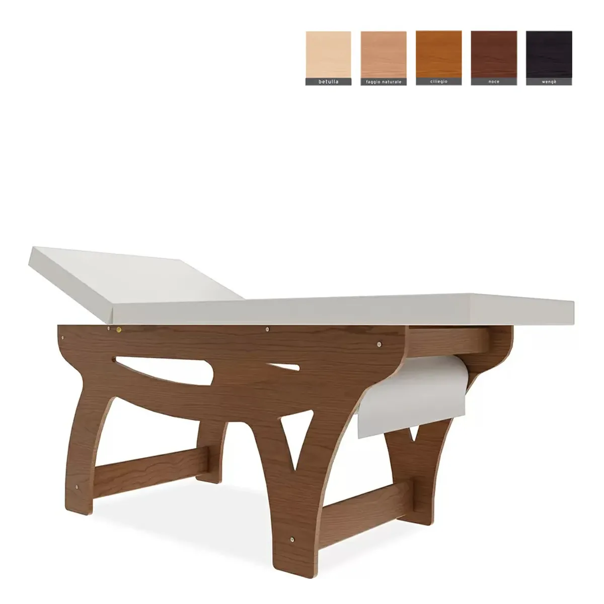 Realizzato interamente in legno multistrato di betulla in finitura ciliegio, unisce solidità e design elegante. L’imbottitura in espanso 25/D garantisce comfort ottimale durante i trattamenti, mentre il rivestimento in skai lavabile, disponibile nei colori bianco o beige, assicura praticità e igiene.