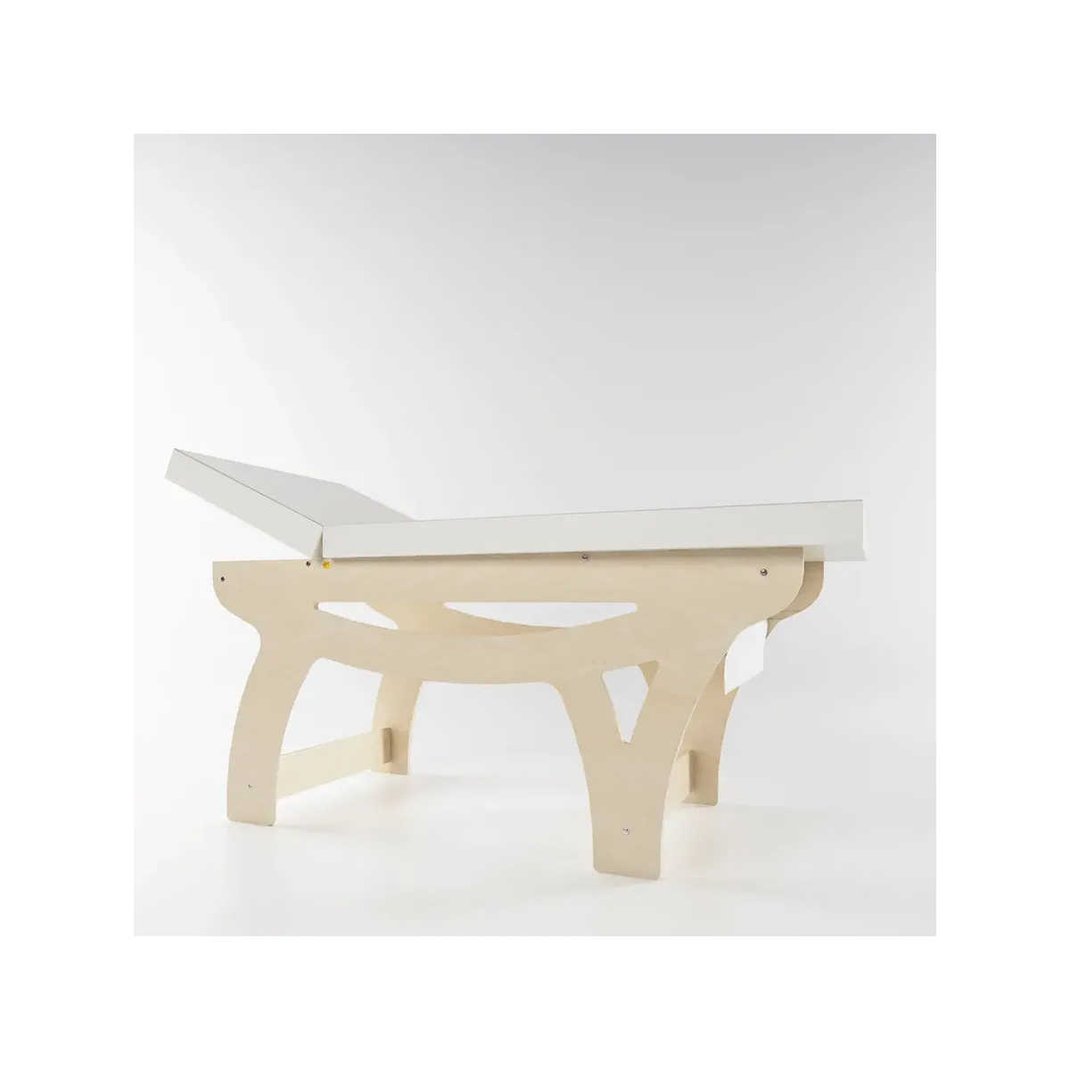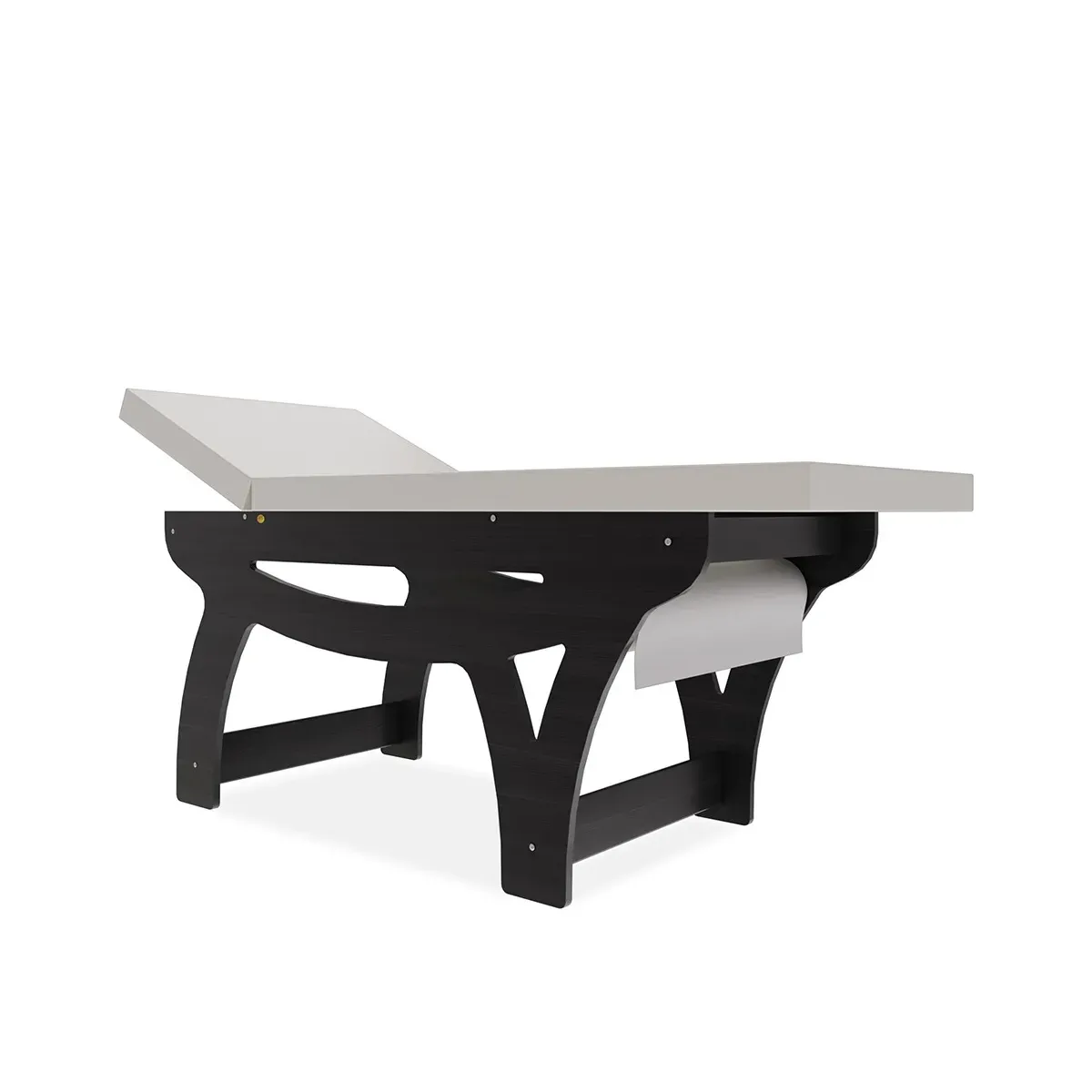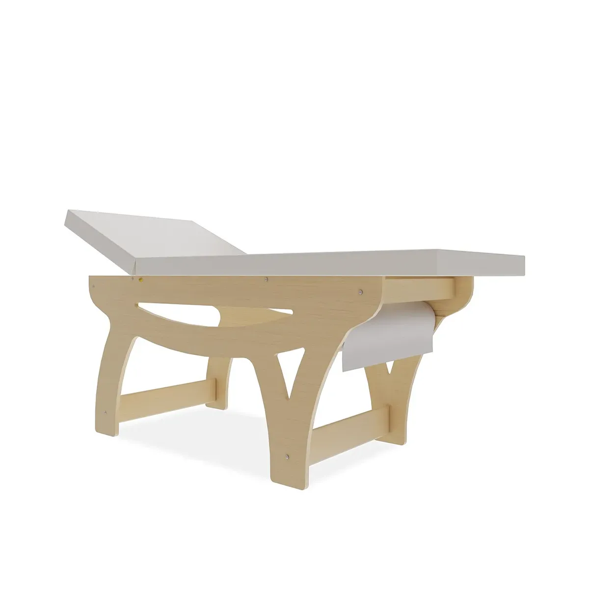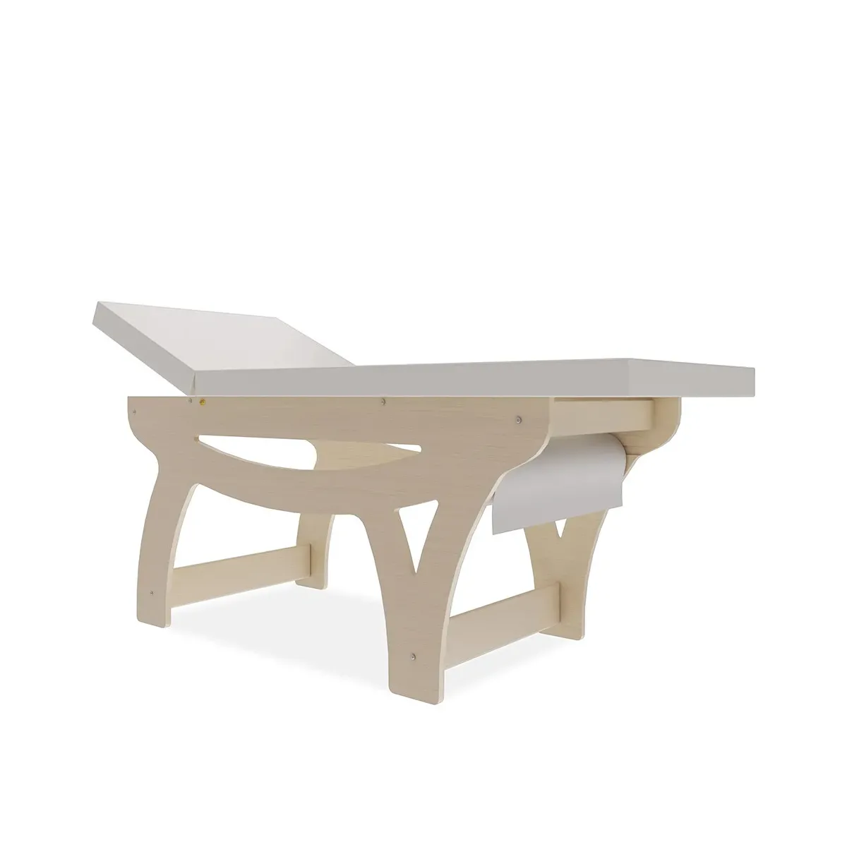La testata è regolabile grazie a robuste cerniere in acciaio zincato, permettendo di adattare l’inclinazione secondo le esigenze del trattamento. Inoltre, il lettino è dotato di porta rotolo integrato, per una gestione semplice e veloce della carta monouso.