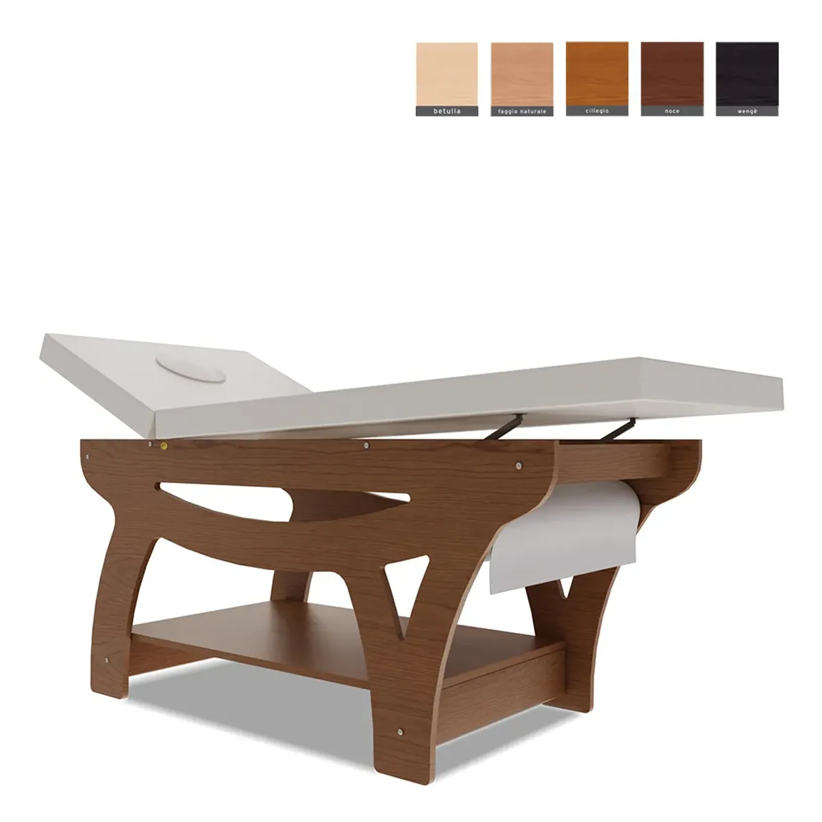 Realizzato interamente in legno multistrato di betulla in finitura ciliegio, unisce solidità e design elegante. L’imbottitura in espanso 25/D garantisce comfort ottimale durante i trattamenti, mentre il rivestimento in skai lavabile, disponibile nei colori bianco o beige, assicura praticità e igiene.