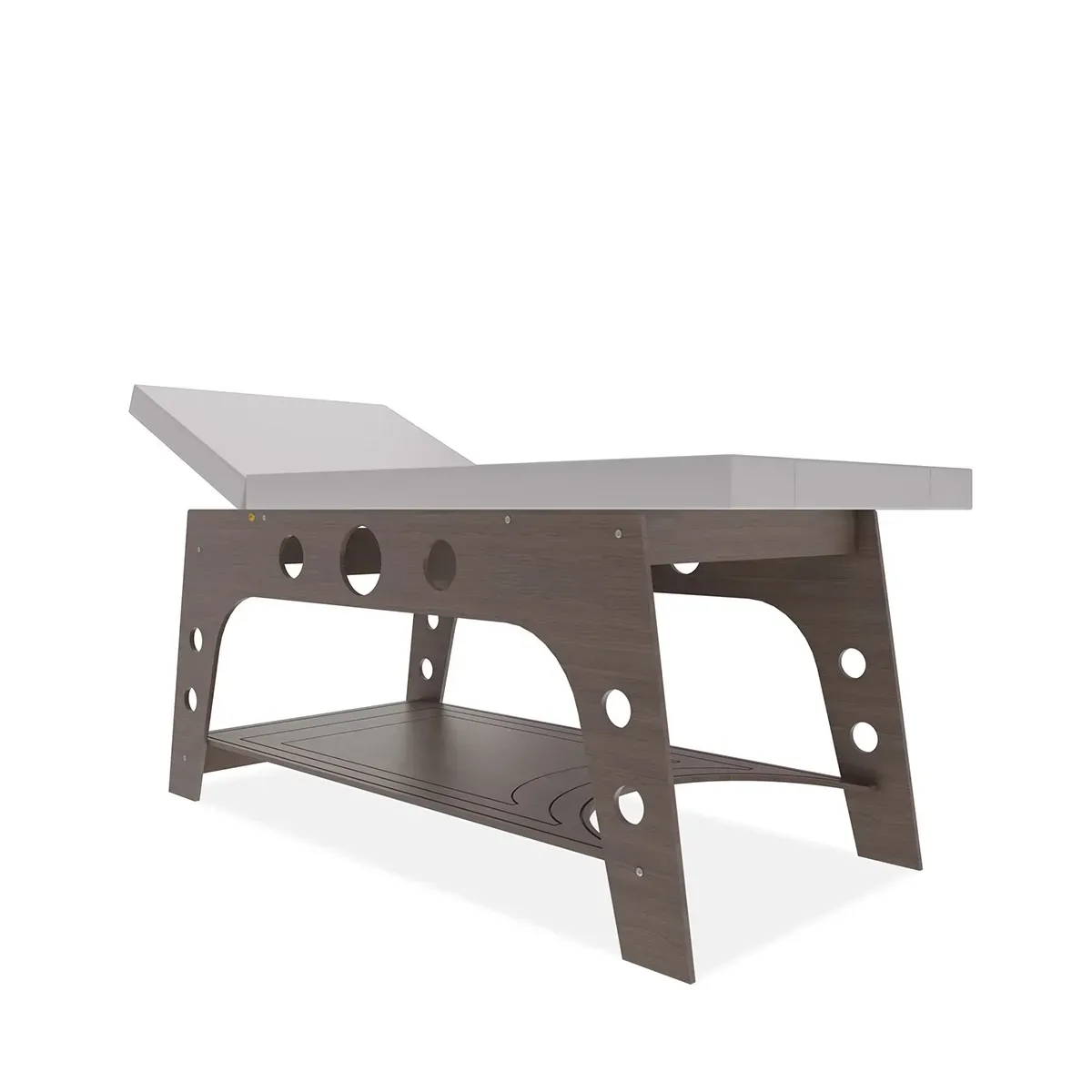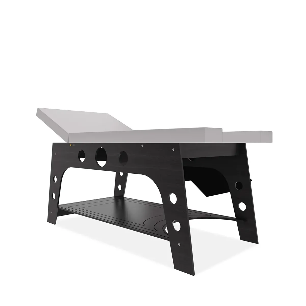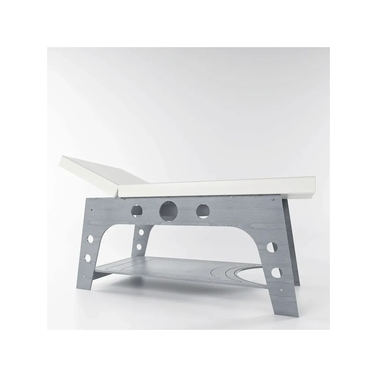 La particolare forma del lettino e l'inclinazione regolabile della testata permettono di adattare la posizione in modo da soddisfare le esigenze di ogni tipologia di trattamento. Inoltre, il comodo piano inferiore offre spazio sufficiente per appoggiare oli essenziali, prodotti cosmetici o rotoli di carta monouso, tenendo tutto a portata di mano durante la seduta.