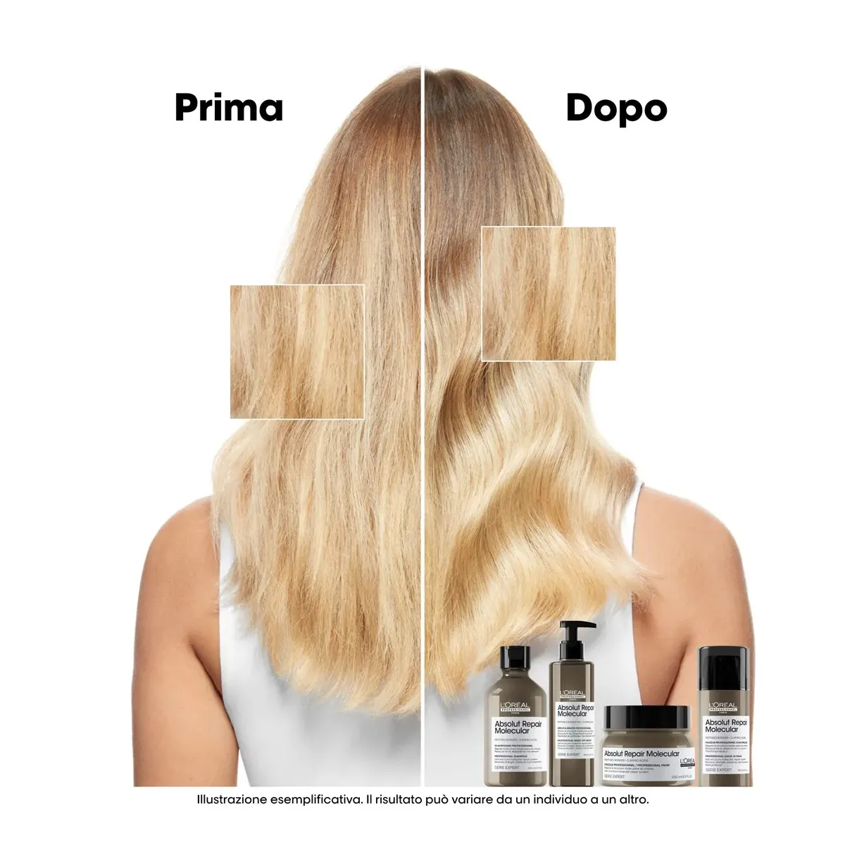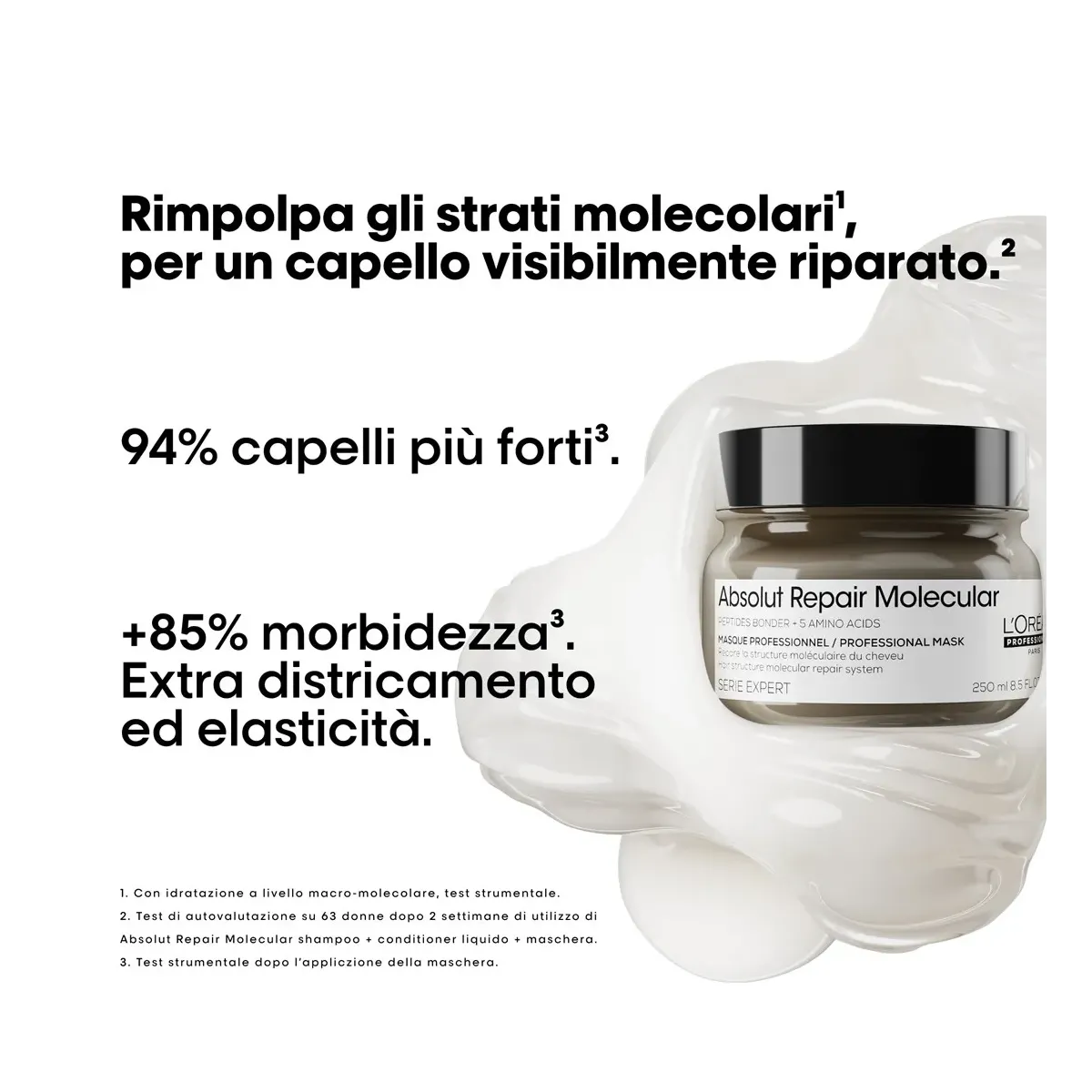 l'Oreal Maschera Absolut Repair Molecular Rimpolpa gli strati molecolari del capello*. +94% forza, +85% morbidezza**. Extra districamento ed elasticità.Questa maschera concentrata, formulata con Legante peptidico + 5 Amminoacidi, aiuta a ricostruire la struttura molecolare del capello** e rimpolpa gli strati molecolari del capello. I capelli sono 94% più forti e 85% più morbidi. L'elasticità e il movimento sono migliorati.