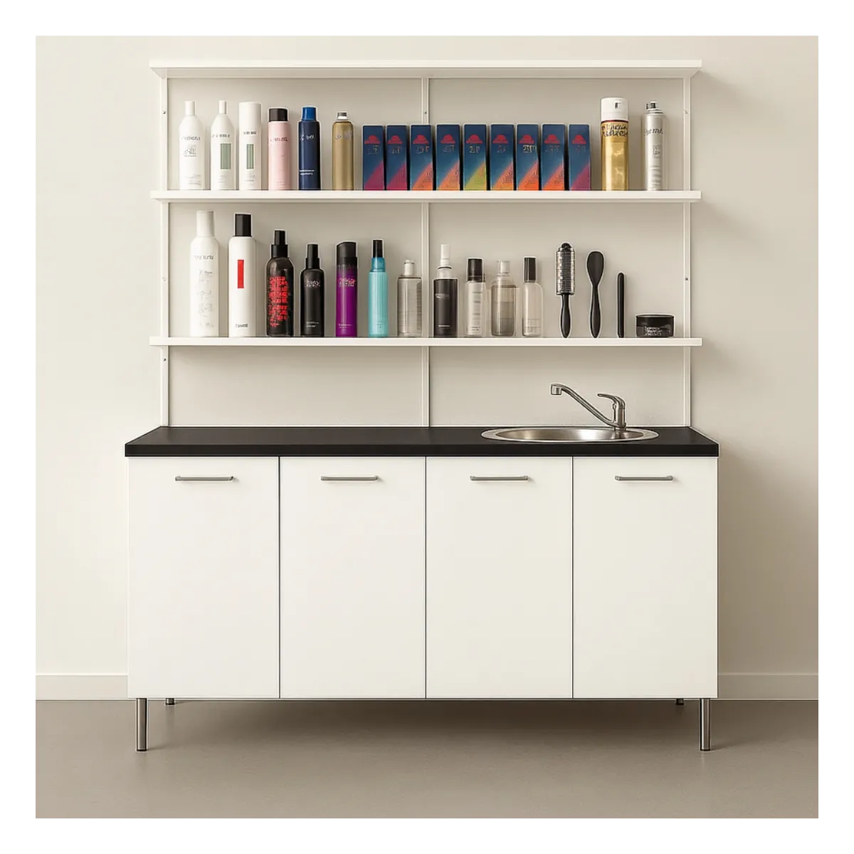 Mensole superiori per un’esposizione ordinata e funzionale di tinte, prodotti e accessori professionali.