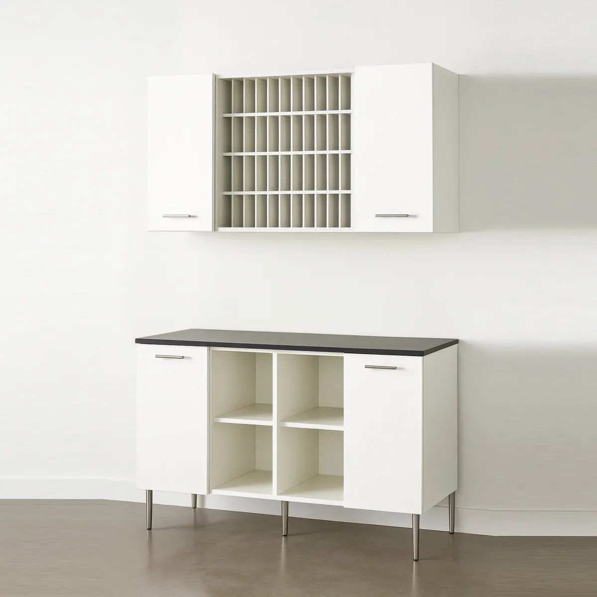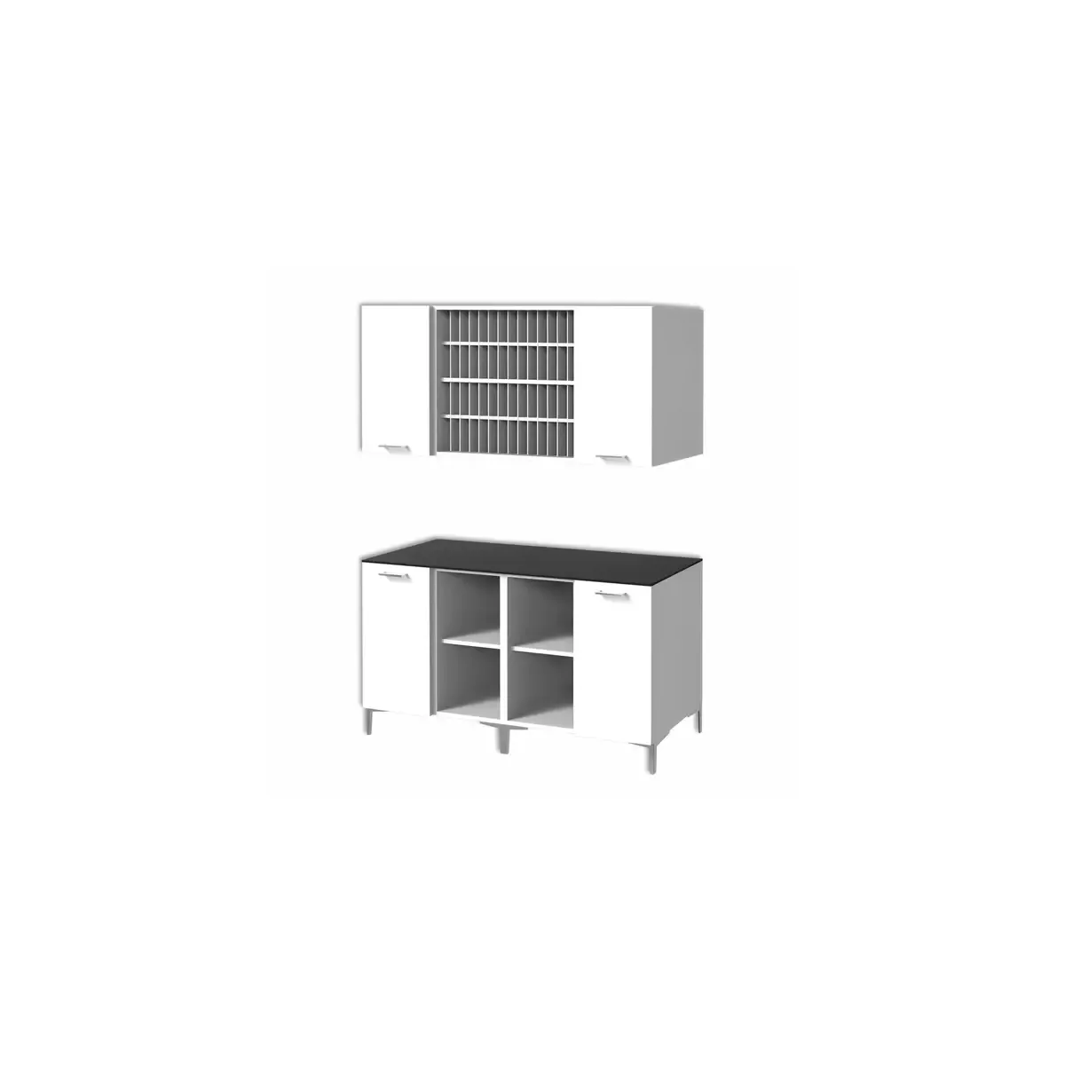 Ampio spazio contenitivo inferiore, con ante laterali e vano giorno centrale per prodotti e strumenti.
