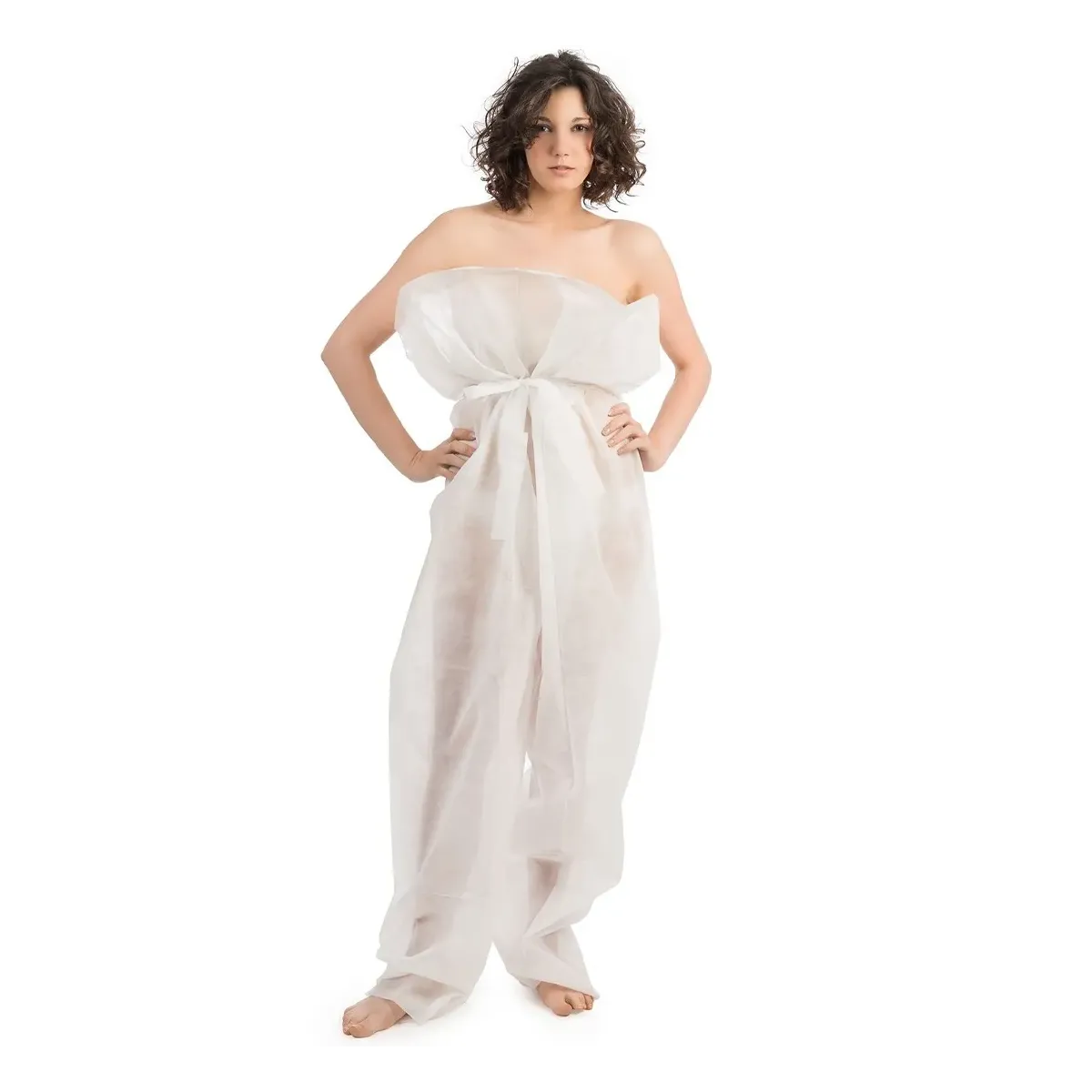 Questa tuta monouso in TNT (tessuto non tessuto) è progettata per garantire igiene, comfort e praticità durante trattamenti estetici, massaggi, spa e centri benessere. Il design ampio e senza spalline, con chiusura frontale a fiocco, consente una vestibilità versatile e sicura, adattandosi perfettamente a qualsiasi corporatura.