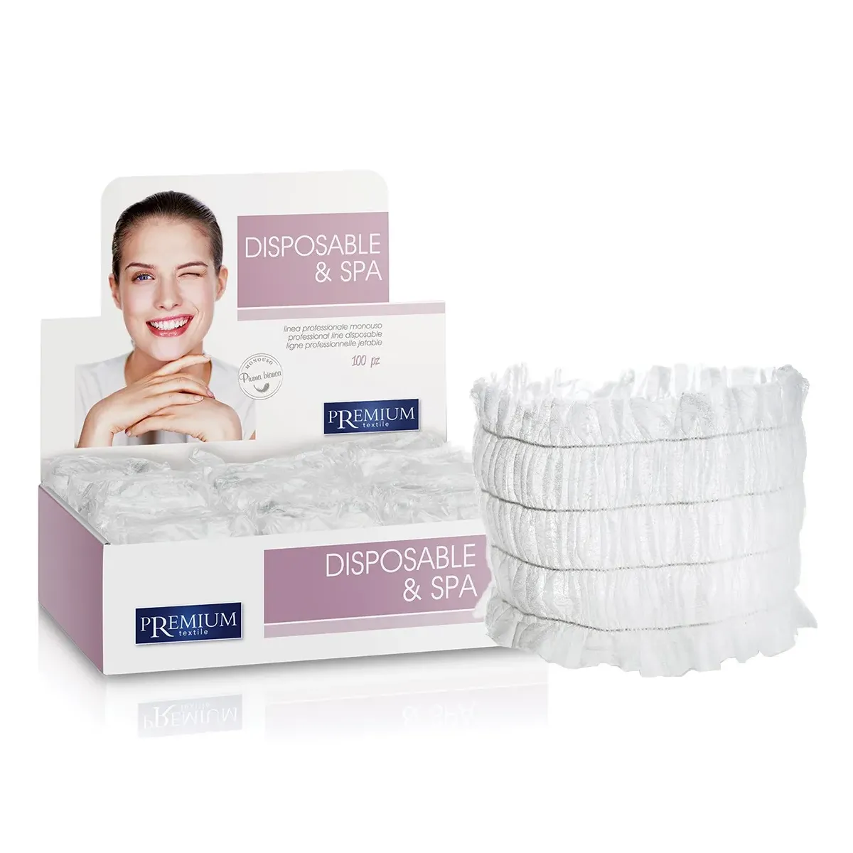 Mantieni l'igiene e il comfort nei tuoi trattamenti estetici con le fasce monouso in TNT (tessuto non tessuto) della linea Disposable & Spa di PREMIUM Textile. Perfette per centri estetici, spa, saloni di bellezza e ambienti professionali, queste fasce sono ideali per proteggere i capelli del cliente durante trattamenti viso, make-up o massaggi.