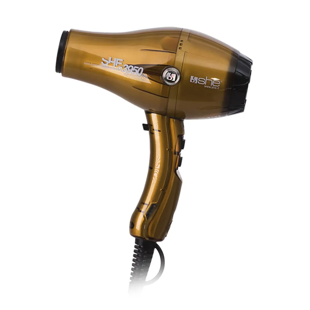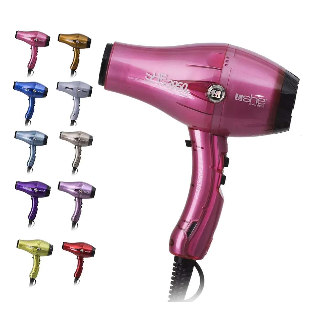 SHE propone una vasta gamma di asciugacapelli realizzati tenendo in considerazione le fondamentali caratteristiche professionali richieste dai parrucchieri per quanto riguarda la potenza, la robustezza e maneggevolezza. I fon SHE sono dotati di dispositivo ionizzatore che idrata i capelli eliminandone l’elettricità statica, design ergonomico per una migliore maneggevolezza, tecnologia in ceramica e tormalina per una temperatura uniforme e non eccessiva. I fon SHE sono disponibili in moderni colori per soddisfare ogni gusto.