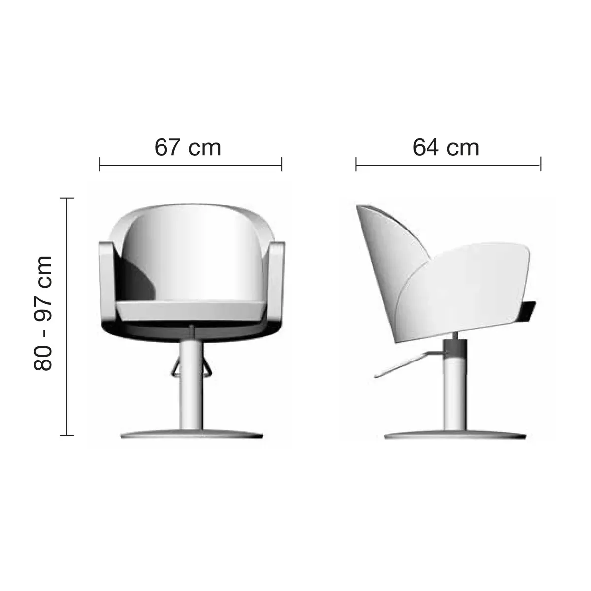 Poltrona parrucchiere con schienale e seduta in poliuretano schiumato con inserto in legno multistrato e metallo. Rivestimenti skai ecopelle a scelta. Base girevole in alluminio con pompa idraulica e freno.