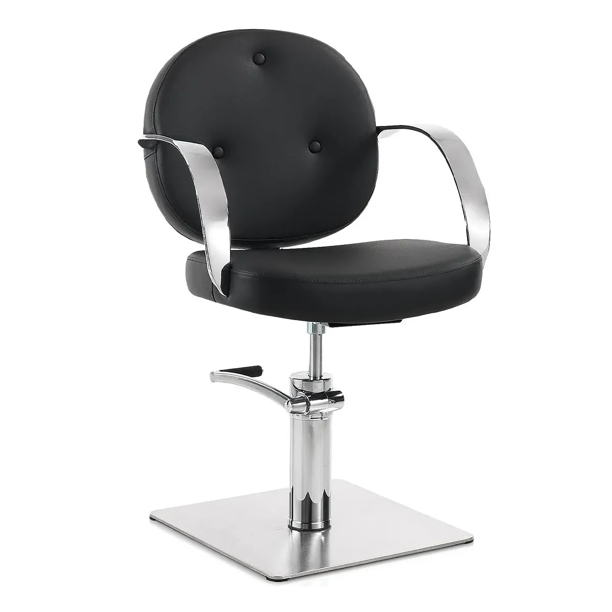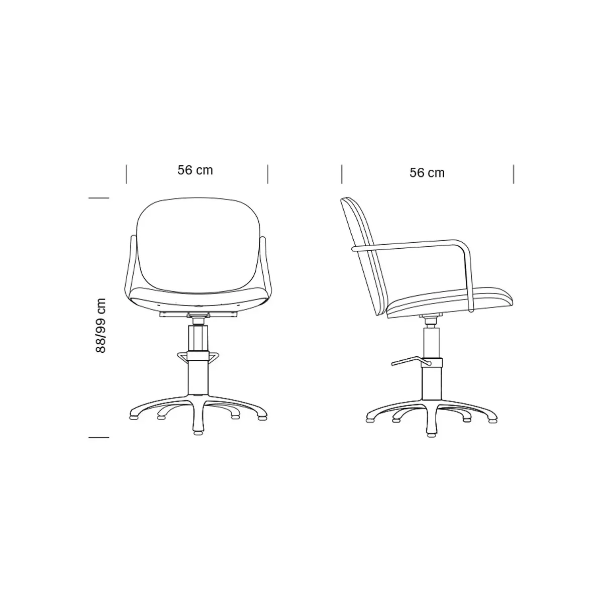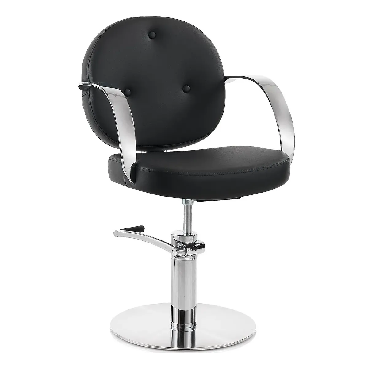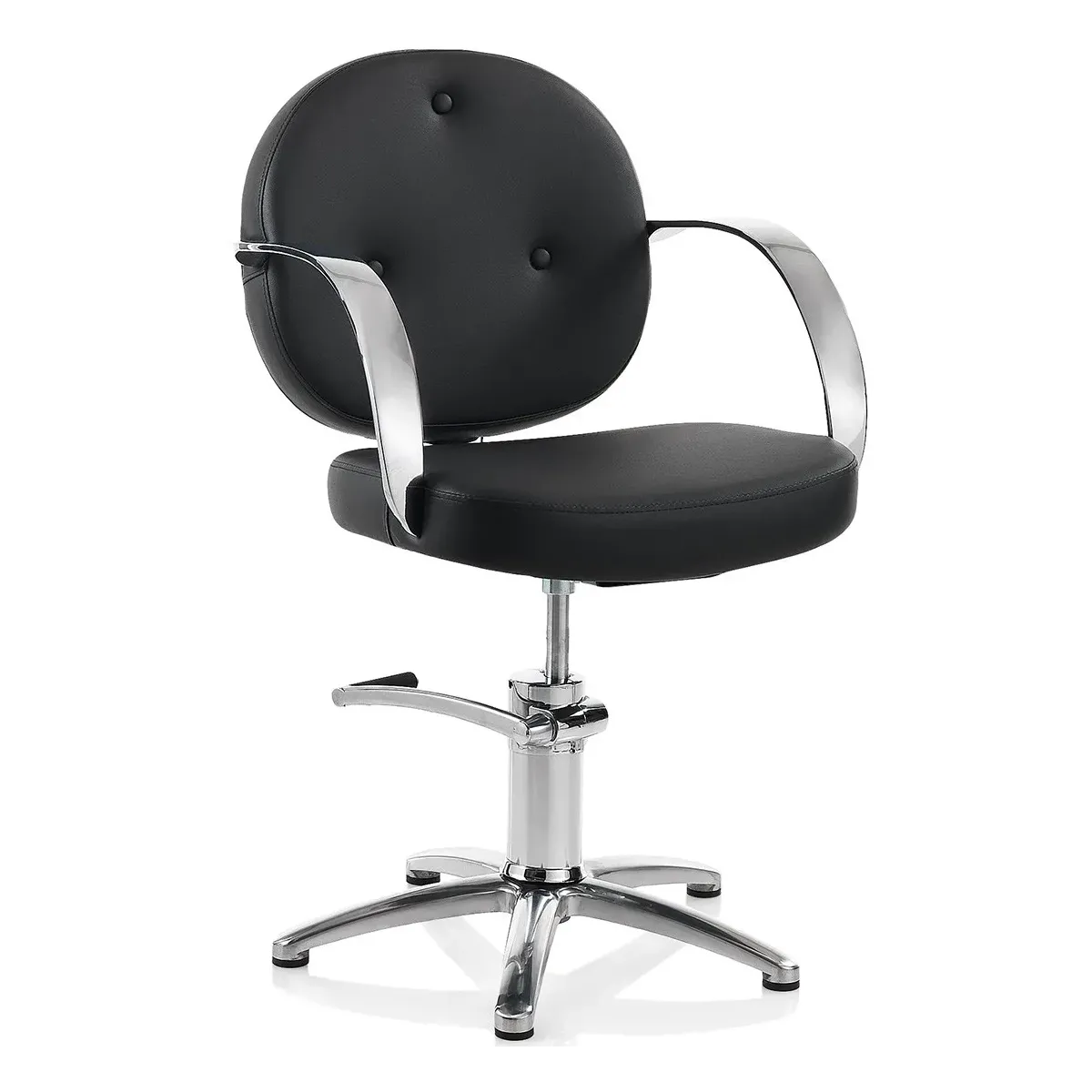 Poltrona parrucchieri di colore nero caratterizzata da un particolare schienale trapuntato ed una comoda seduta imbottita ad alta densità. È provvista di 2 braccioli curvi per dare più confort ed arricchire il design. La struttura è in acciaio cromato e termina con una base che ha un sistema a pompa idraulica per regolare l'altezza della seduta; inoltre è possibile scegliere la base di forma tonda, quadrata e a stella.