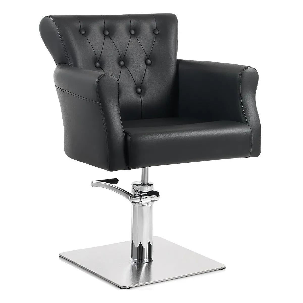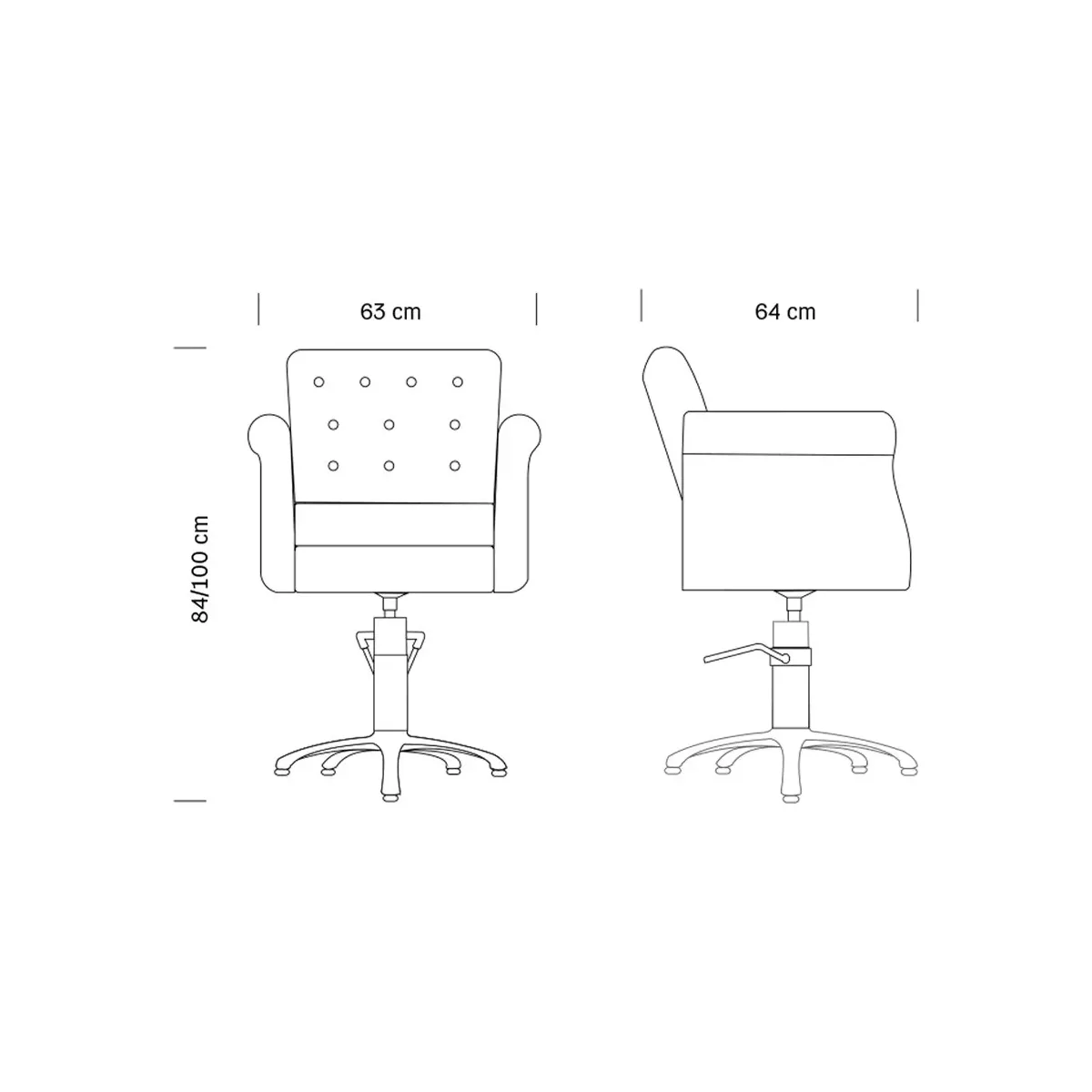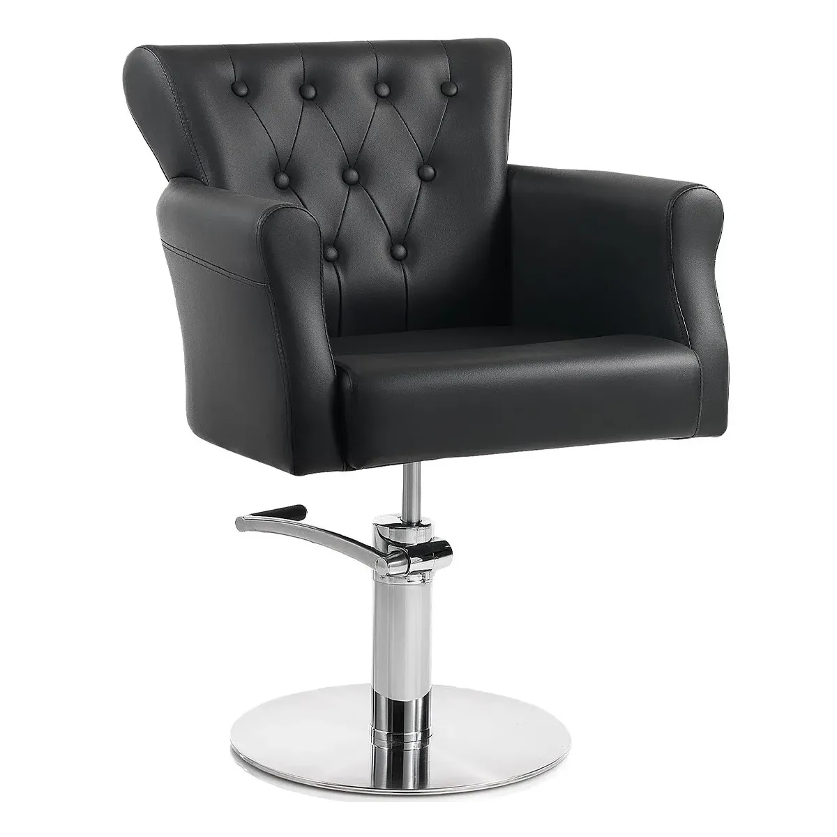 Poltrona per Parrucchiere dallo stupendo design a forma di trono e con schienale trapuntato. La seduta si presenta ampia e confortevole con un imbottitura ad alta densità di cui sono fatti anche i comodi braccioli. La struttura è solida e resistente, realizzata in acciaio cromato e comprende una base con pompa idraulica e freno, inoltre è possibile sceglierla di forma tonda, quadrata e a stella.