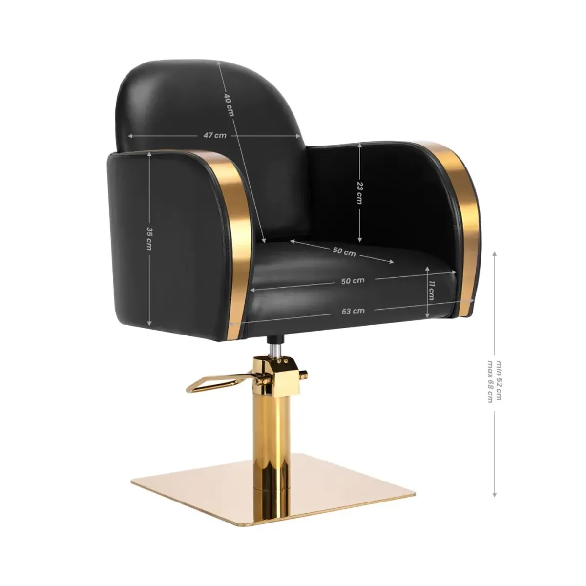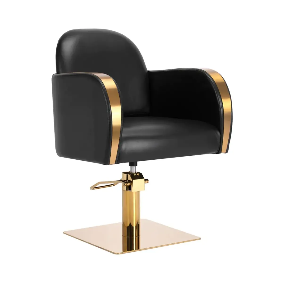 Poltrona Parrucchieri Oro Eleva l'arredamento del tuo salone con la nostra esclusiva Poltrona per Parrucchiere Nera con Base Quadrata e Dettagli Oro. Questa poltrona è un connubio perfetto tra stile, comfort e funzionalità, ideale per offrire ai tuoi clienti un'esperienza di lusso durante i loro trattamenti.