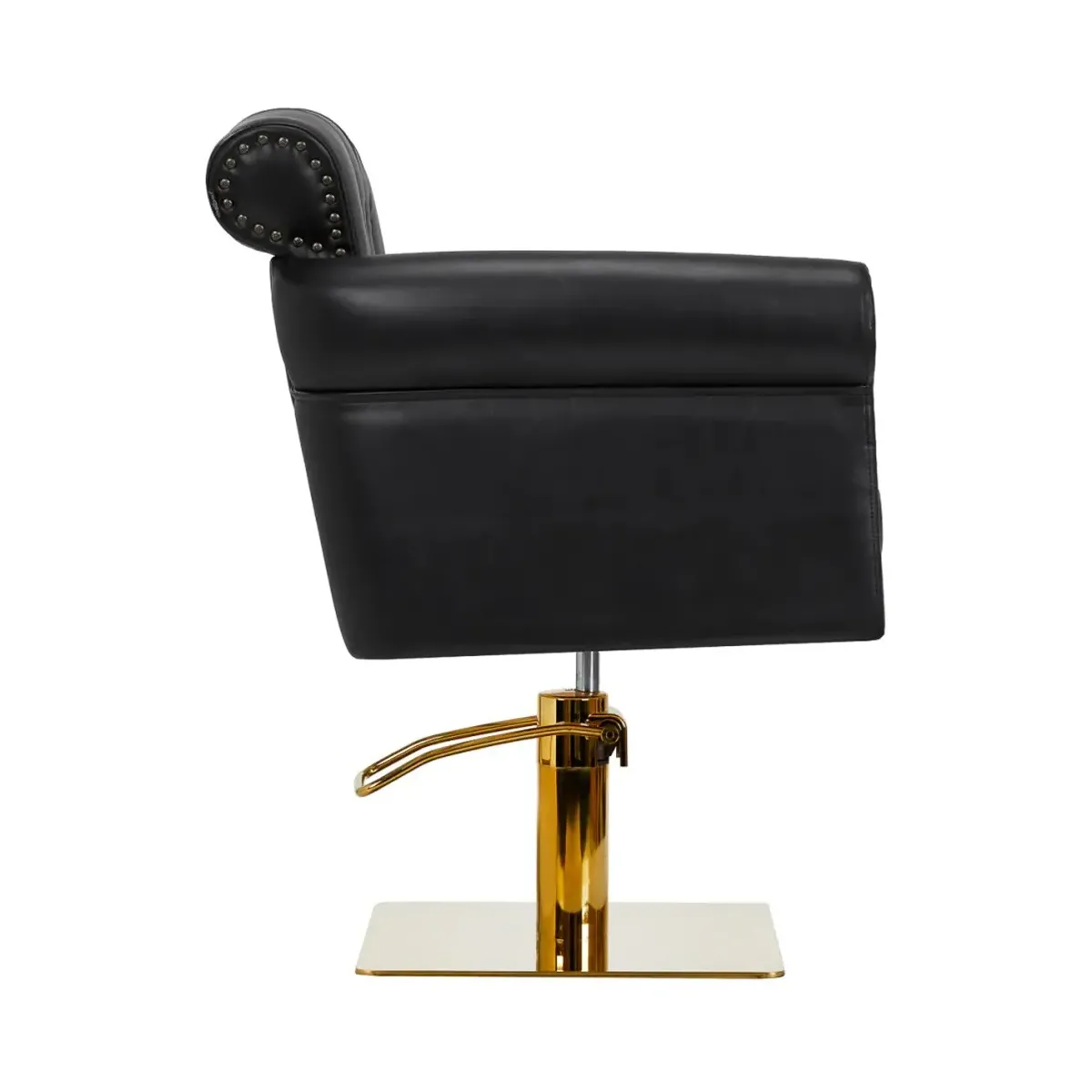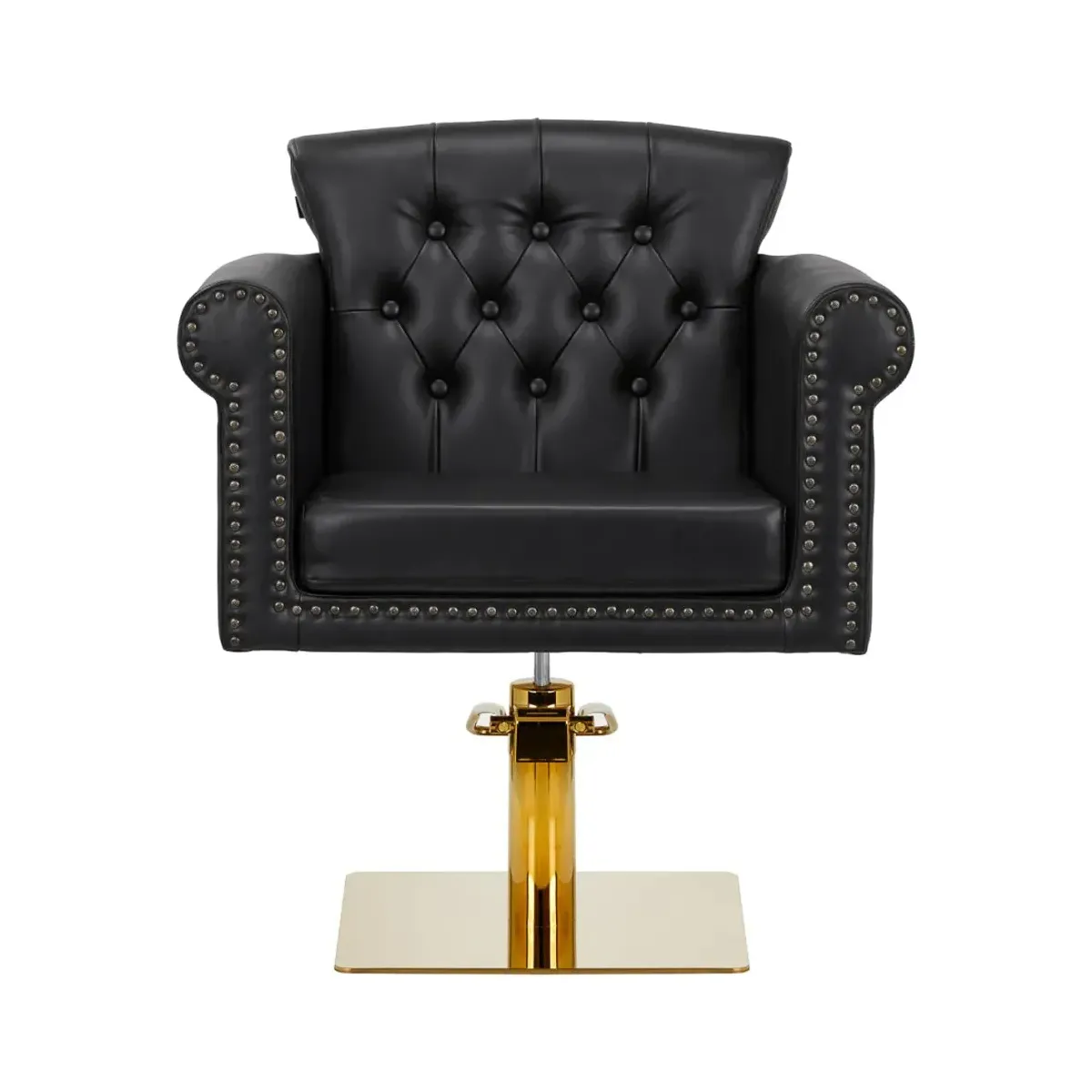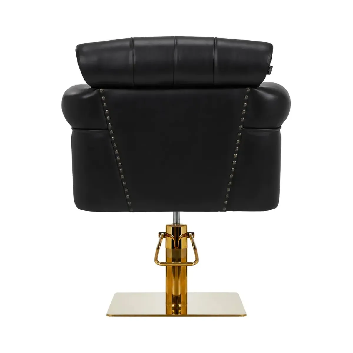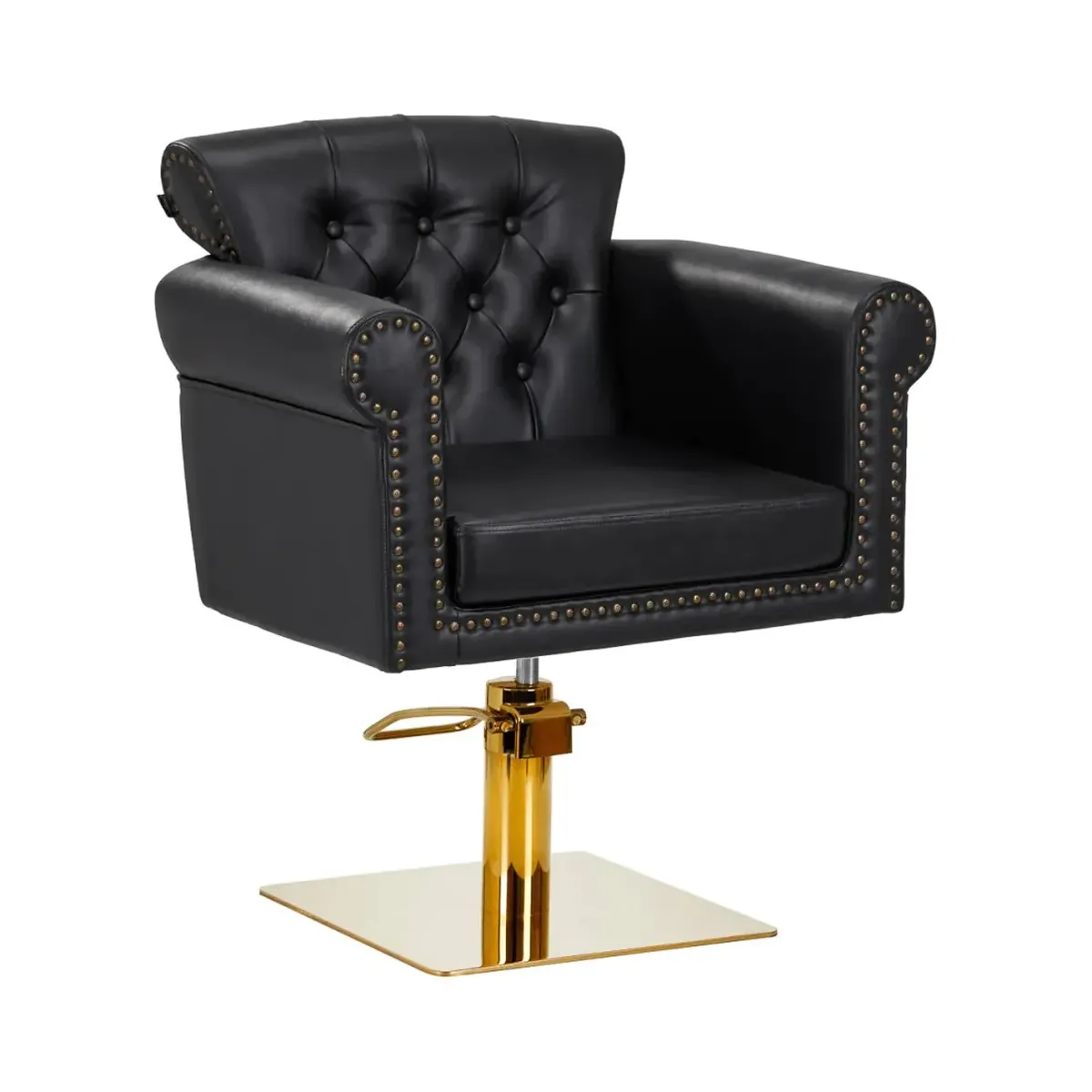Poltrona Parrucchiera Trapuntata con base in oro Eleva lo stile del tuo salone con la nostra esclusiva poltrona da parrucchiere, un connubio perfetto tra design raffinato, comfort superiore e funzionalità professionale. Rivestita in ecopelle nera di alta qualità, questa poltrona si distingue per l'elegante trapuntatura sullo schienale, un dettaglio che aggiunge un tocco di lusso e sofisticatezza.