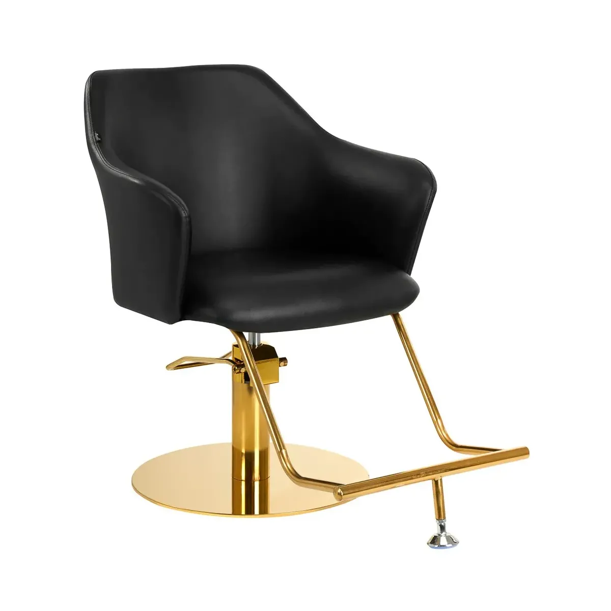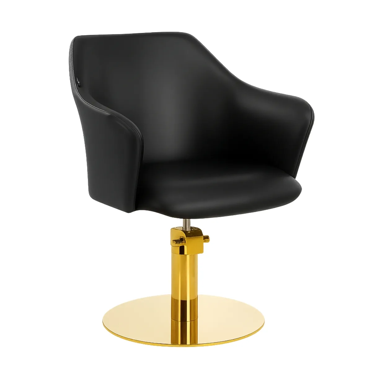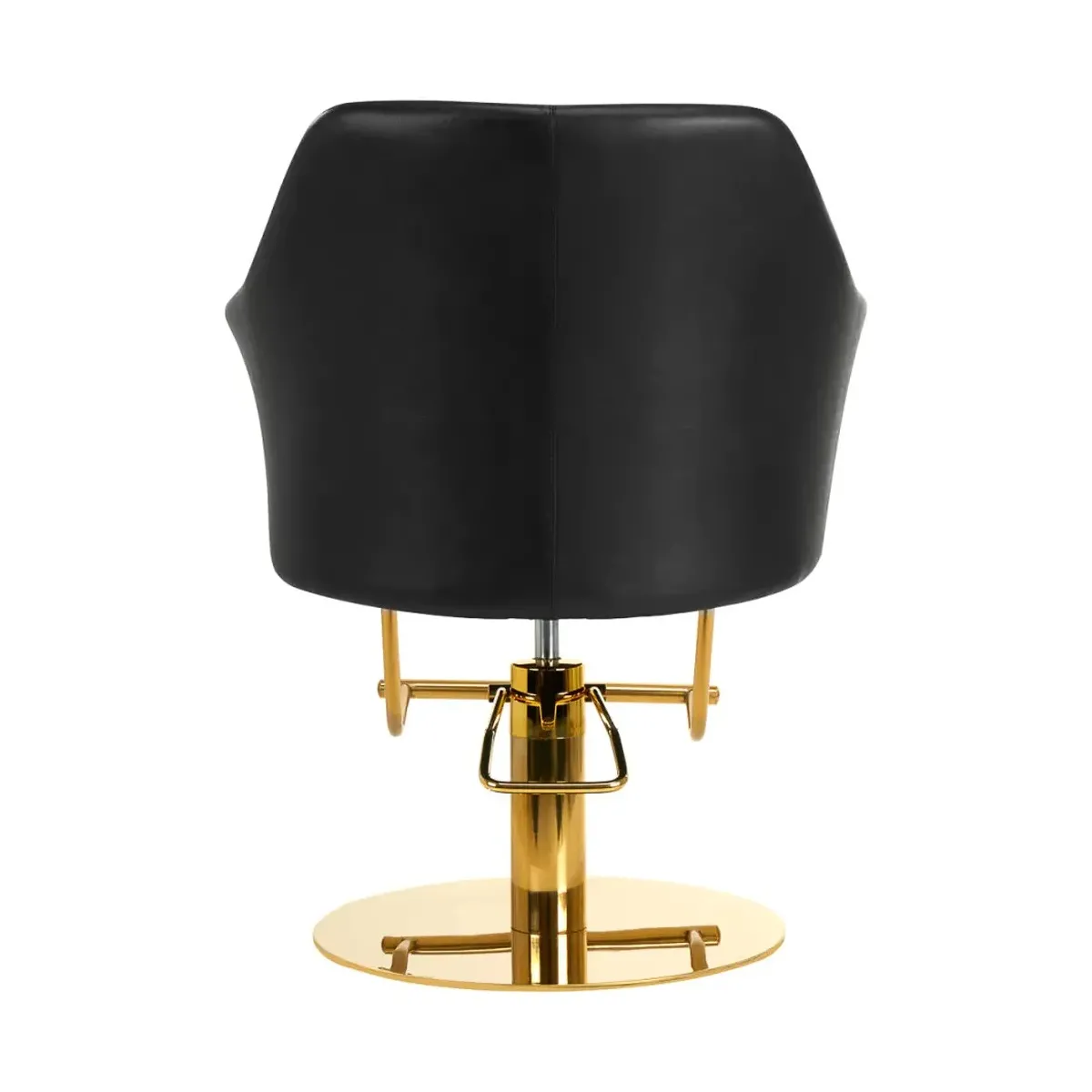 Sedia Parrucchiere Nera con struttura in Oro Eleva l'arredamento del tuo salone con questa splendida poltrona da parrucchiere, un perfetto connubio tra eleganza classica e design moderno. La Poltrona Nera con Struttura in Oro è pensata per offrire il massimo comfort ai tuoi clienti e un tocco di lusso al tuo ambiente di lavoro.