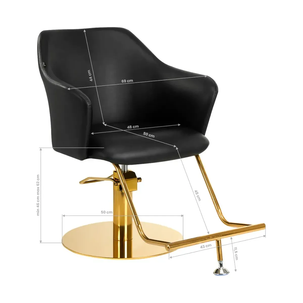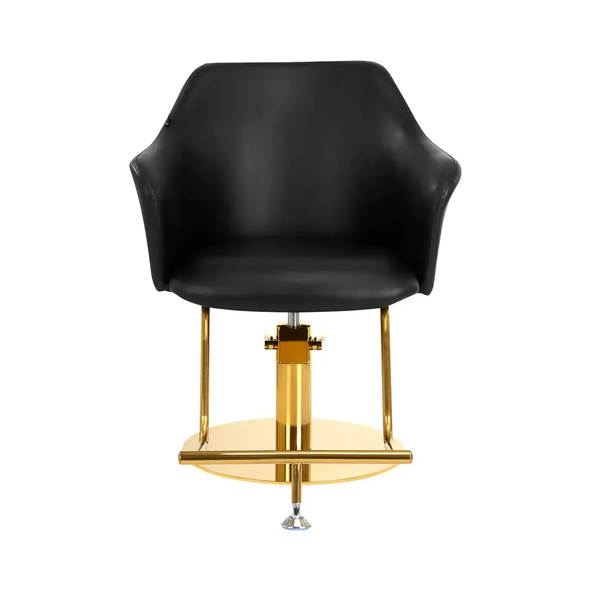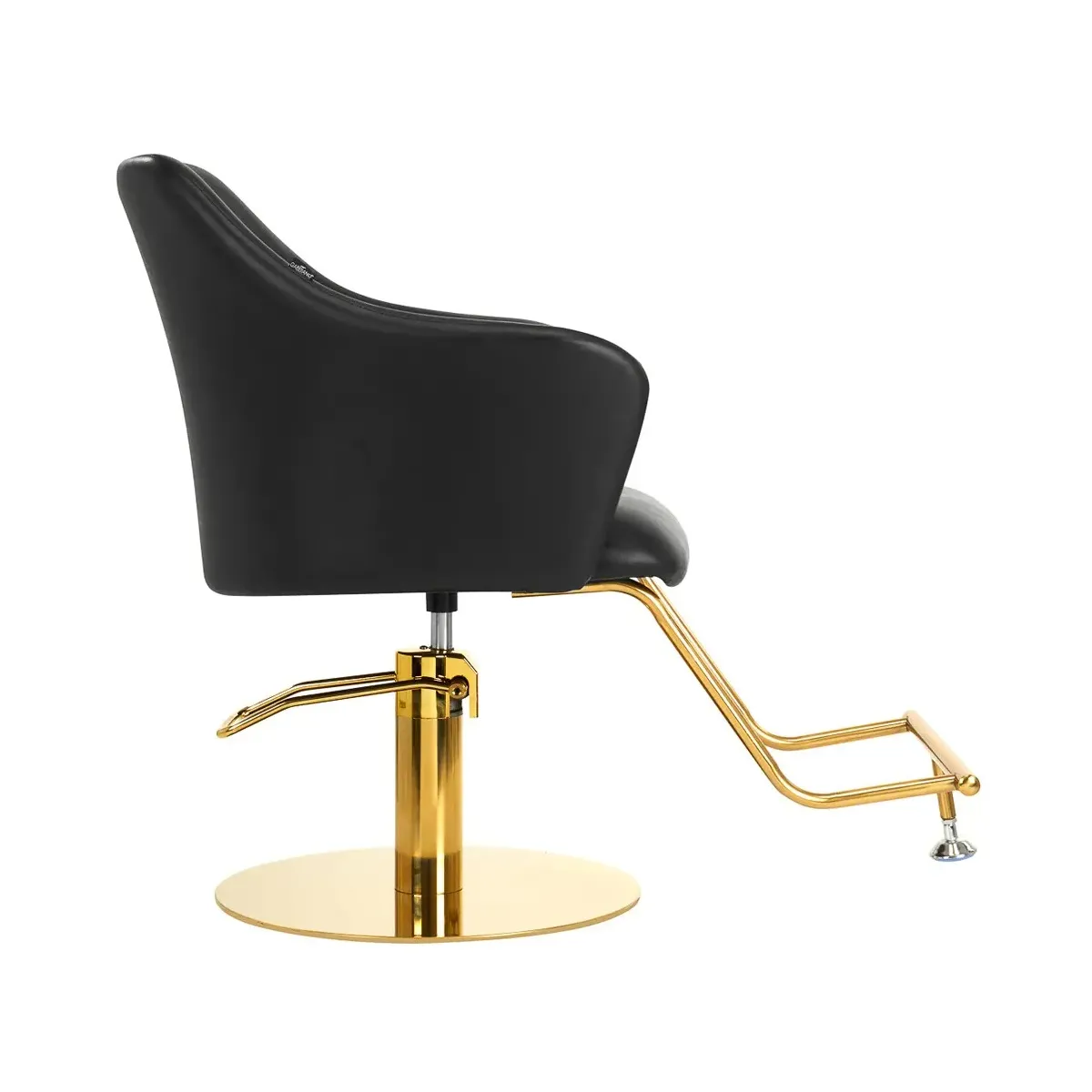 Sedia Parrucchiere Nera con struttura in Oro Eleva l'arredamento del tuo salone con questa splendida poltrona da parrucchiere, un perfetto connubio tra eleganza classica e design moderno. La Poltrona Nera con Struttura in Oro è pensata per offrire il massimo comfort ai tuoi clienti e un tocco di lusso al tuo ambiente di lavoro.