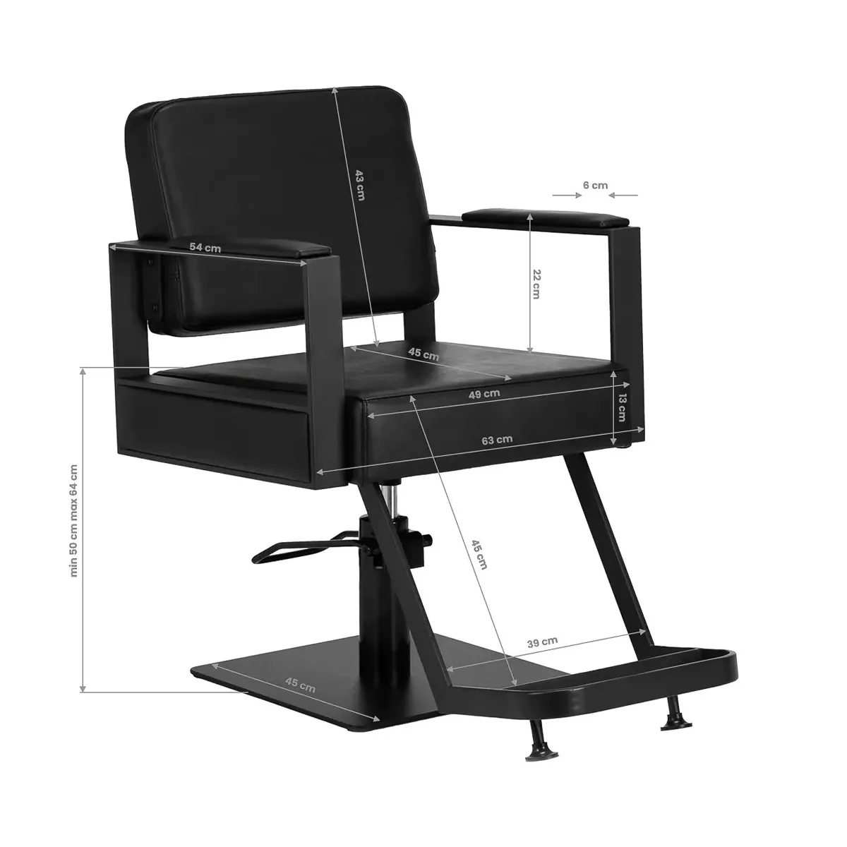 Altezza Regolabile: La poltrona è dotata di un sistema di regolazione dell'altezza (min 50 cm, max 64 cm) per adattarsi alle esigenze di ogni cliente e facilitare il lavoro del parrucchiere.