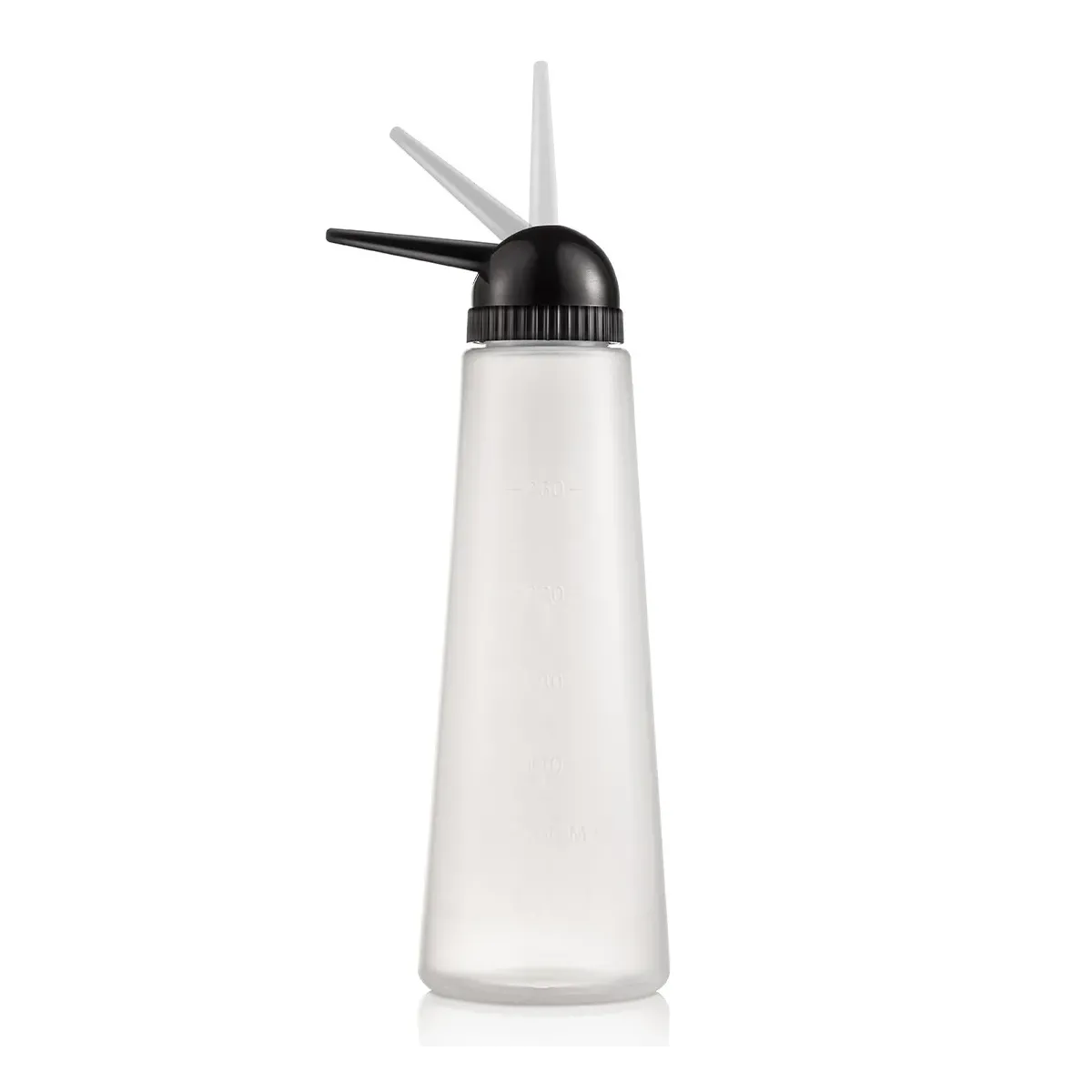 Applicatore per tinta capelli con indicatore misurino fino a 260 ml e dotato di beccuccio snodato per posizionare bene la direzione della tintura capelli. Utilizzato dai parrucchieri nei propri saloni hair.
