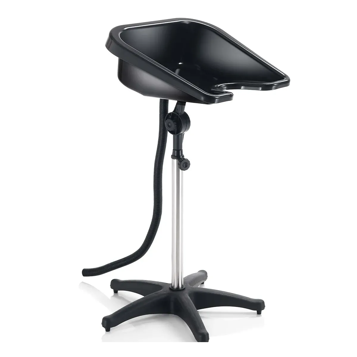 Lavatesta parrucchiere portatile da lavandino con altezza regolabile da 42 a 118 cm. È inoltre dotato di vasca basculante in plastica di colore nero che permette un appoggio della testa molto più confortevole ed è provvisto di tubo di scarico. Il lavatesta da casa ha una struttura molto stabile grazie allo stativo in acciaio e la base a 5 razze, ma nonostante tutto rimane un accessorio molto leggero e facile da trasportare. È maggiormente indicato per clienti anziani e persone diversamente abili.