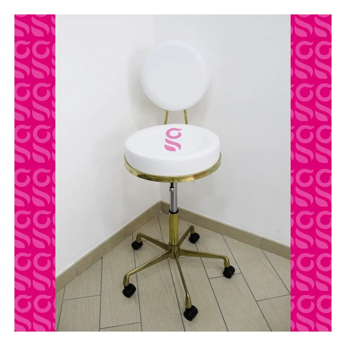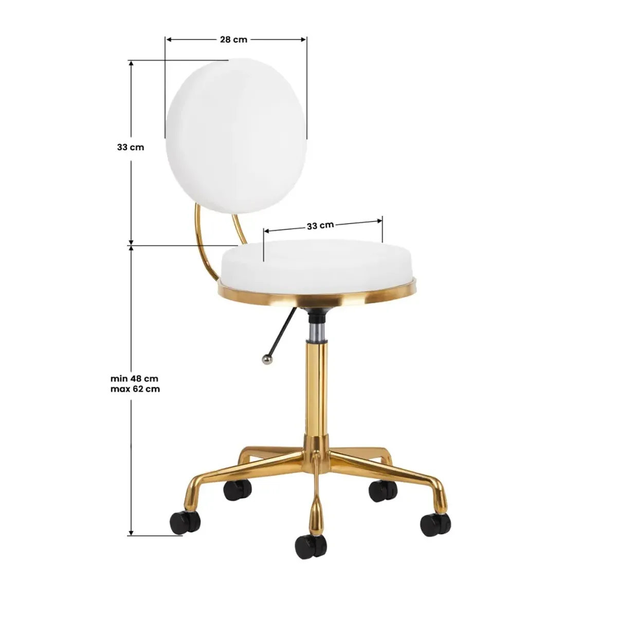 Sgabello EstetistaProfessionale Eleva il tuo spazio di lavoro con lo Sgabello Estetista Professionale, un connubio perfetto tra funzionalità, comfort e design raffinato. Ideale per estetiste, professionisti del settore beauty e chiunque desideri una seduta di alta qualità, questo sgabello si distingue per il suo elegante abbinamento di colori bianco e oro.