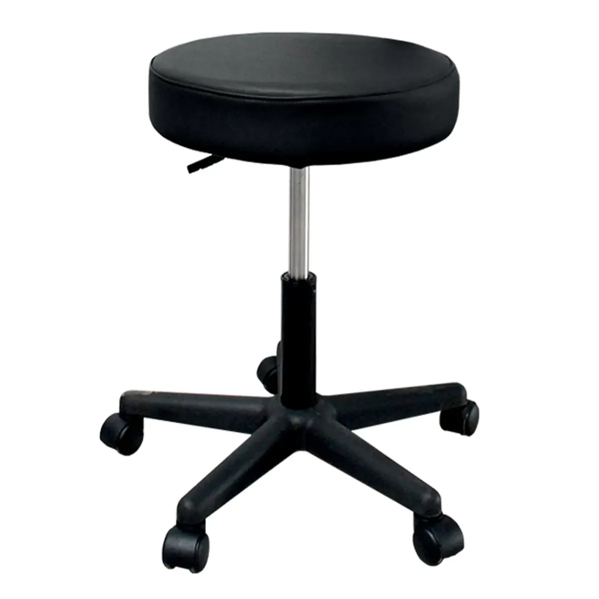 Sgabello Report professionale per estetista, regolabile in altezza, con spessore seduta da 10 cm in ecopelle di colre nero. Dotato di 5 ruote che ne facilitano lo spostamento
