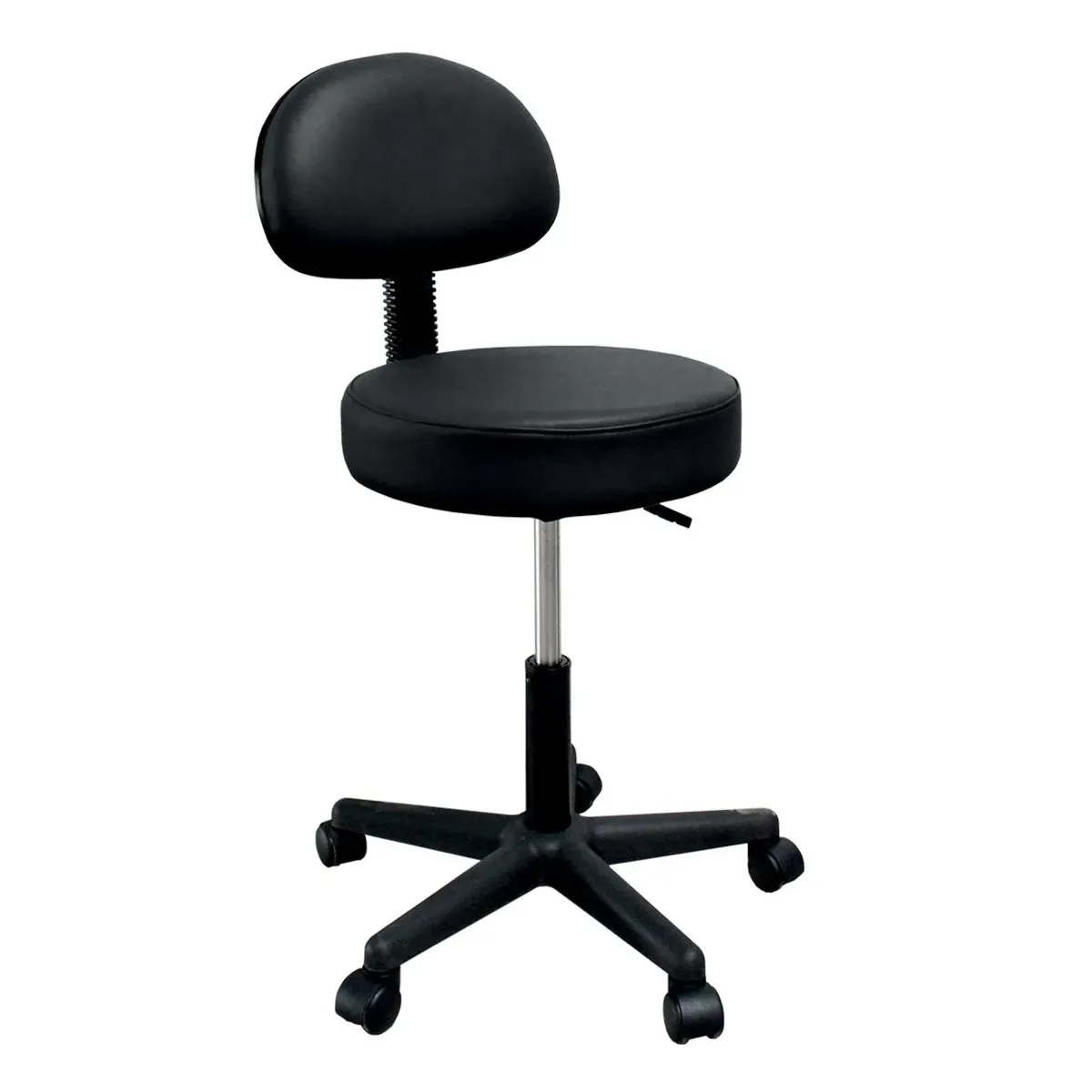 Sgabello Handy con schienale professionale per estetista, regolabile in altezza e schienale. Spessore seduta da 10 cm e spessore schienale da 4 cm. in ecopelle di colre nero. Dotato di 5 ruote che ne facilitano lo spostamento.