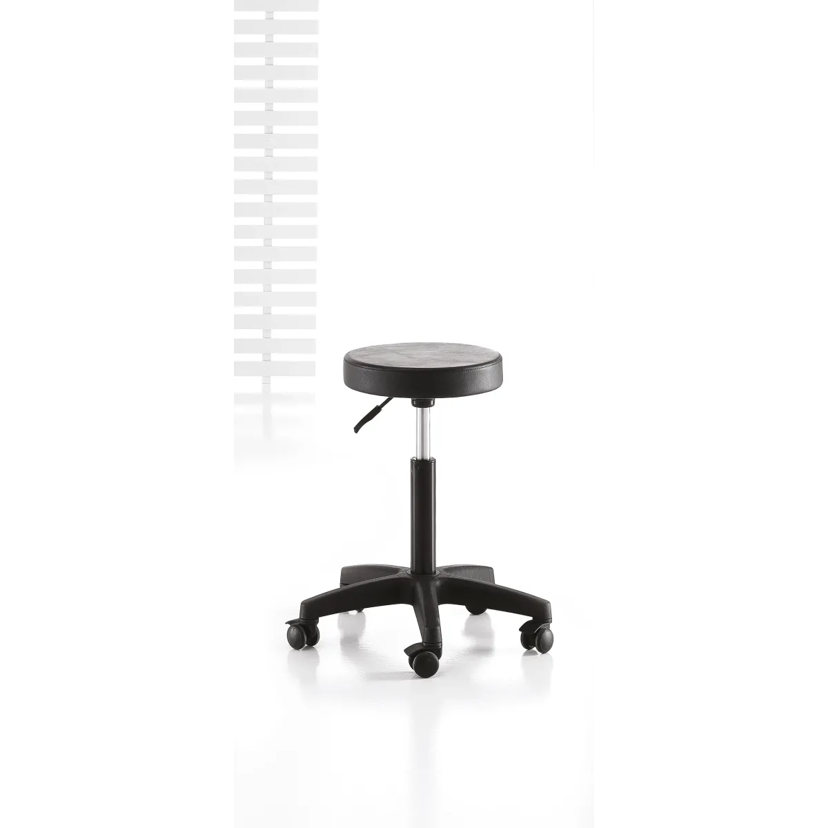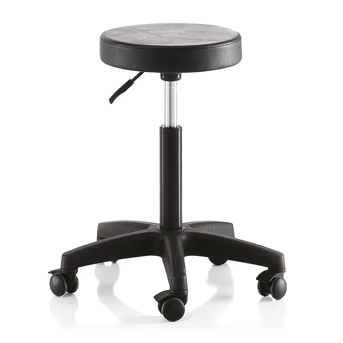 Sgabello Parrucchiere ed Estetista con seduta rivestita in sky ecopelle antigraffio di colore nero.