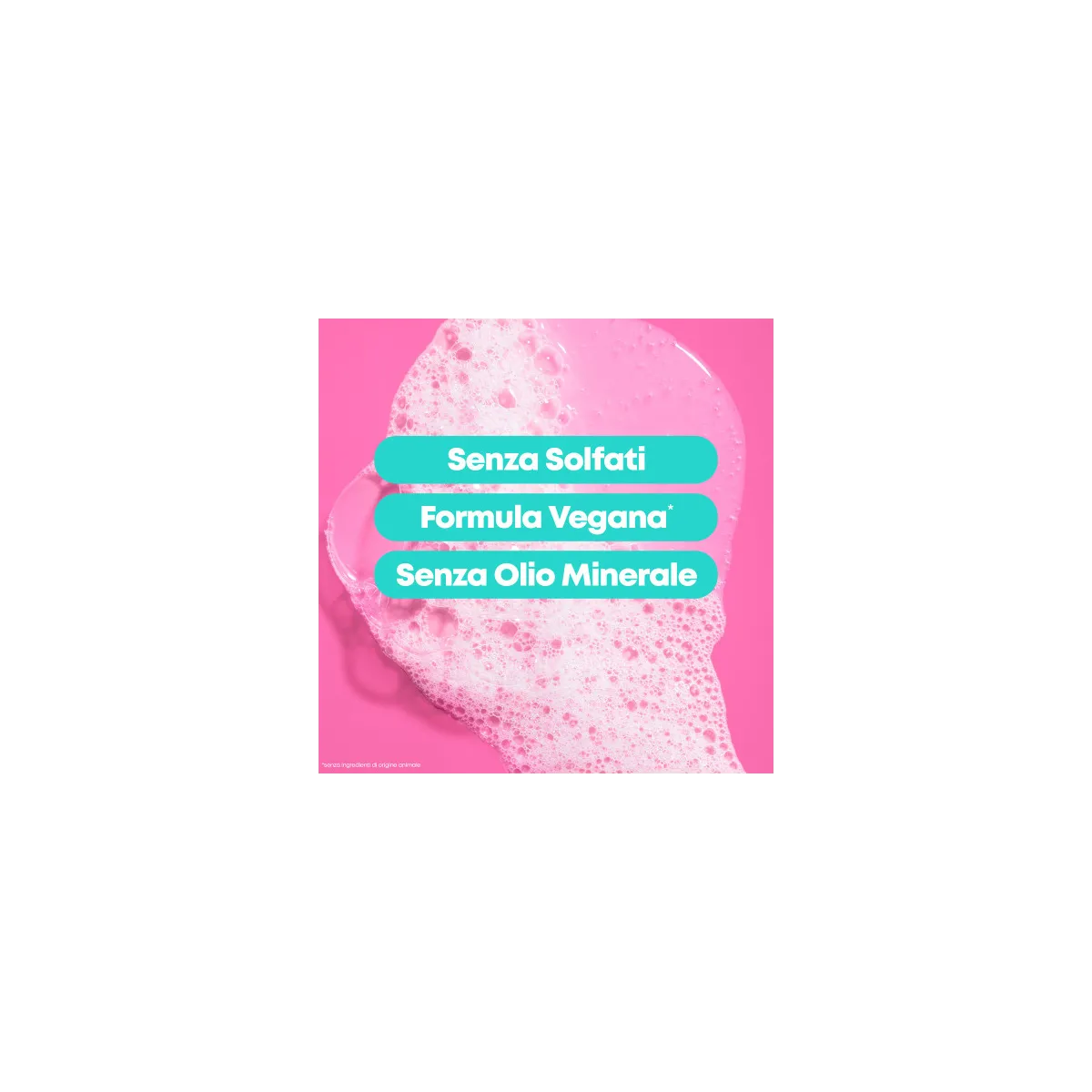 Texture innovativa e divertente: una lussuosa crema liquida rosa che crea una schiuma densa e generosa per detergere delicatamente i capelli.