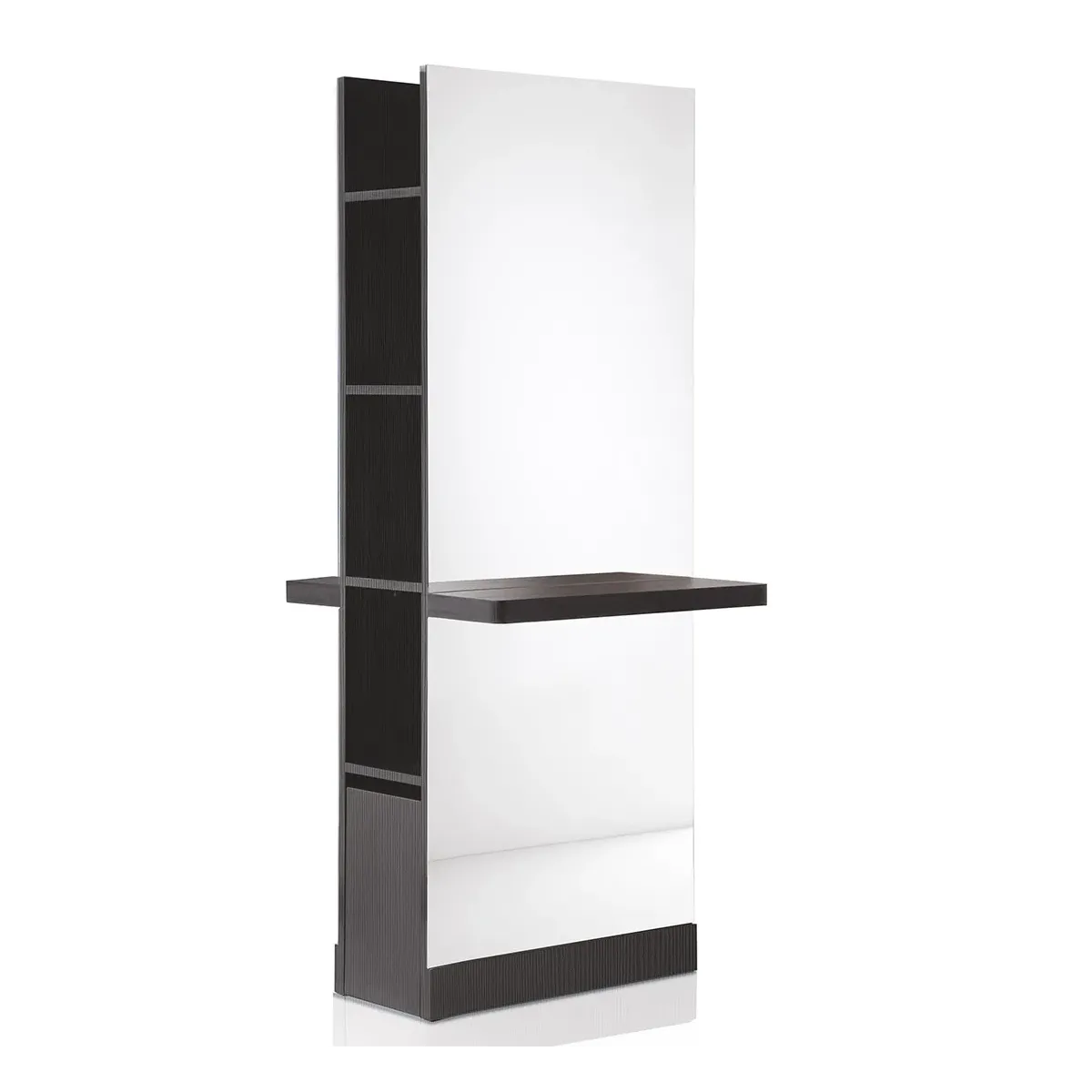 Specchi per Parrucchieri con doppia postazione dalla struttura realizzata interamente in legno nero con specchi incollati ambo i lati permettendo ai professionisti di svolgere il proprio lavoro senza mai intralciarsi tra di loro, lateralmente sono presenti anche 4 vani per ospitare prodotti e attrezzature. Infine frontalmente i due specchi presentano delle mensole d'appoggio in legno utili per permettere ai clienti di riporre i propri oggetti personali.