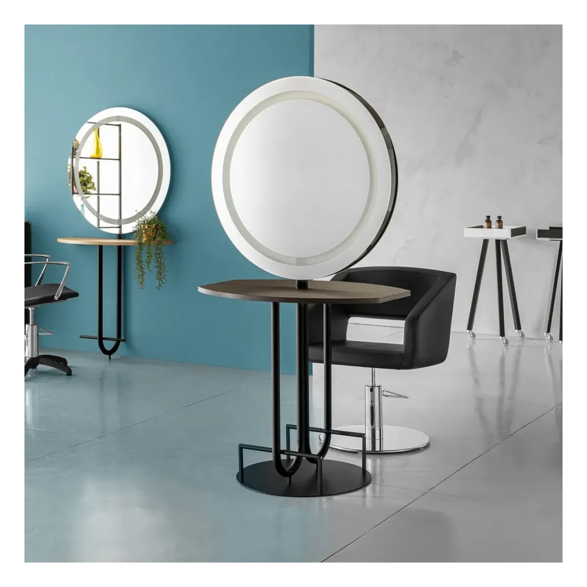 Specchi per Parrucchiere con doppia postazione Juno dallo stile rinnovato con un design dalle linee curve robusto e di lunga durata, facili da combinare in qualsiasi ambiente e stile decorativo. Le due postazioni sono unite da una struttura in acciaio verniciato antracite opaco con 2 piani di lavoro in legno nobilitato disponibili in 3 varianti colore e 2 specchi di forma tonda, perfetti per saloni parrucchiere in stile moderno. Le postazioni styling comprendono anche un poggiapiedi per parrucchieri su entrambi i lati che fanno parte della struttura in acciaio, in questo modo potrete accogliere 2 clienti alla volta, offrendo un servizio veloce ed efficace, fornendo loro grande comfort attraverso questa unica soluzione d'arredo.