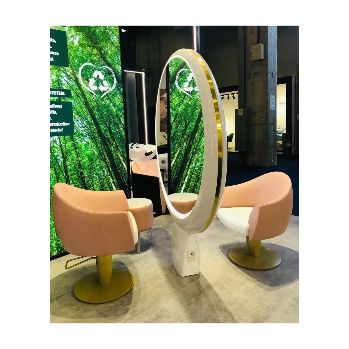 Gli specchi da parrucchiere sono posti ambo i lati della struttura e sono di forma tonda, è possibile su richiesta riceverli con illuminazione a Led per una maggiore precisione durante lo styling ed un effetto wow. Alla base è già presente la predisposizione elettrica con delle prese già pronto all'uso per l'utilizzo di attrezzature come spazzole e phon professionali.