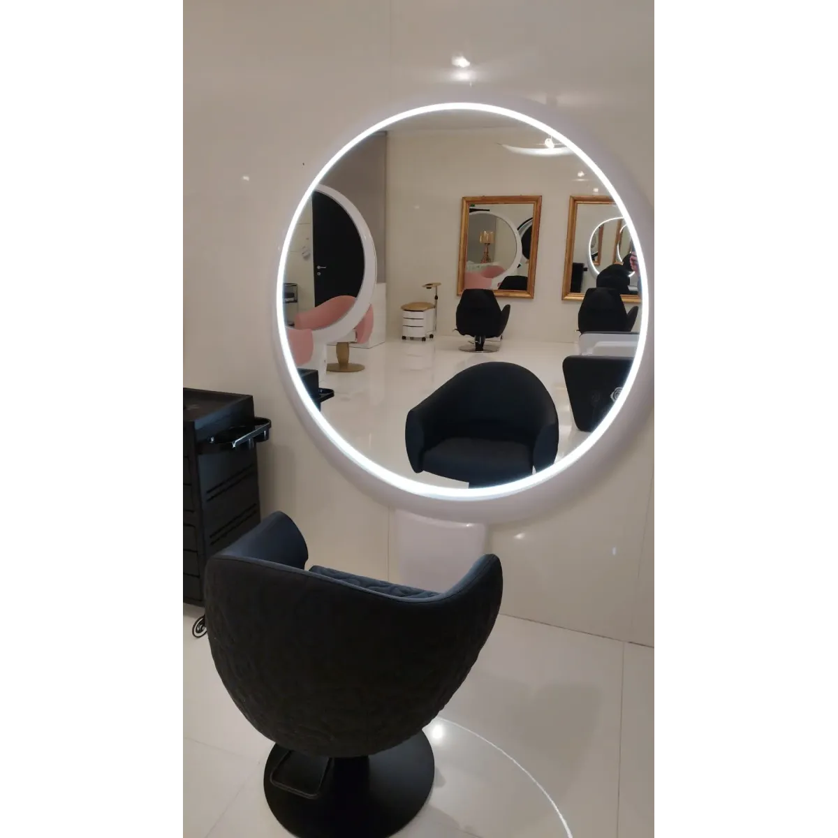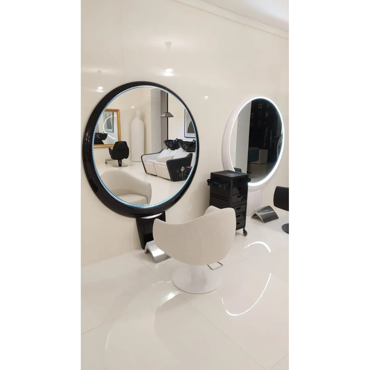 Specchio Parrucchiere Tondo che arricchirà il tuo salone con un tocco moderno grazie all'elegante struttura con fissaggio a parete, una soluzione molto comoda perché permette di arredare l'ambiente senza occupare troppo spazio.