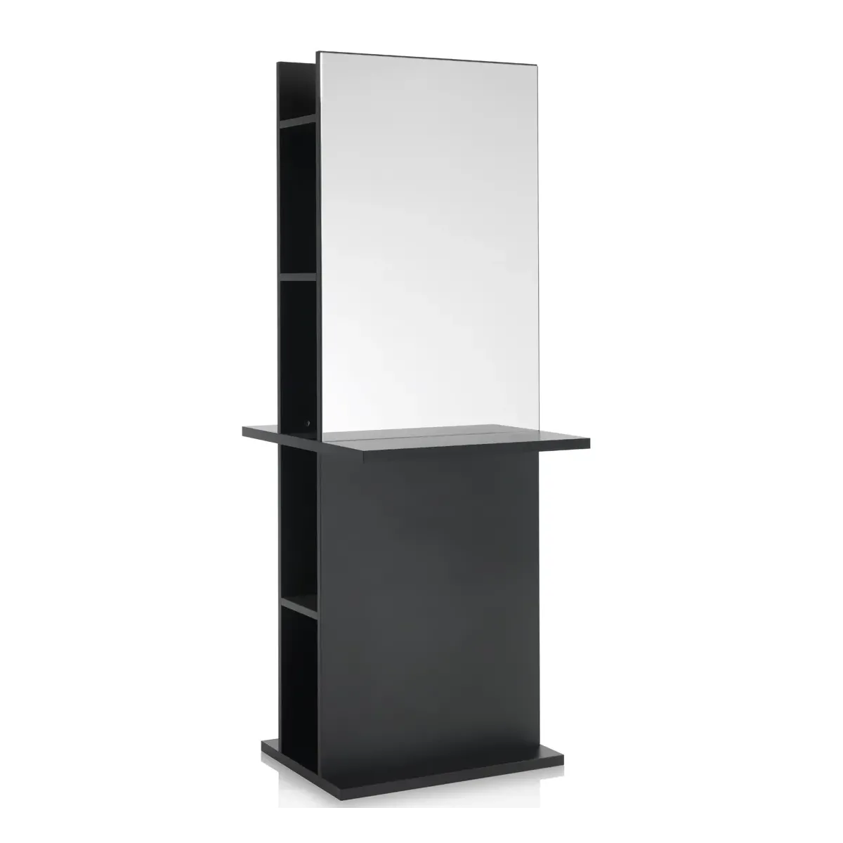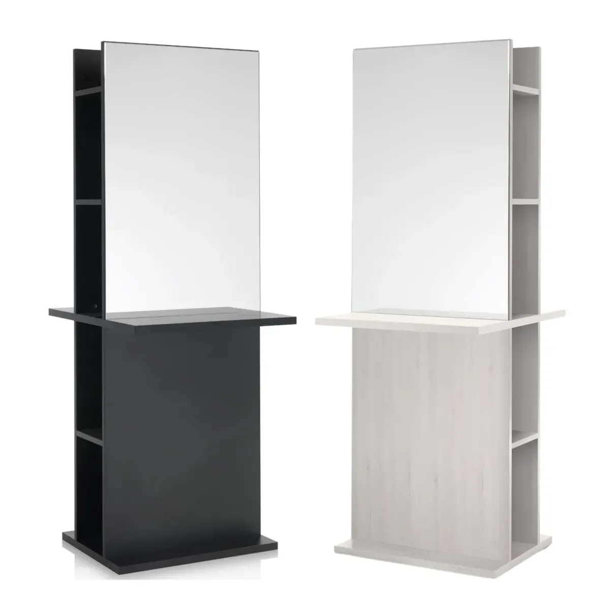 Questo specchio doppio è perfetto per i parrucchieri che desiderano creare un ambiente di lavoro professionale e organizzato. La combinazione di specchio ampio, piani di lavoro resistenti e scomparti laterali rende questo mobile funzionale e versatile.