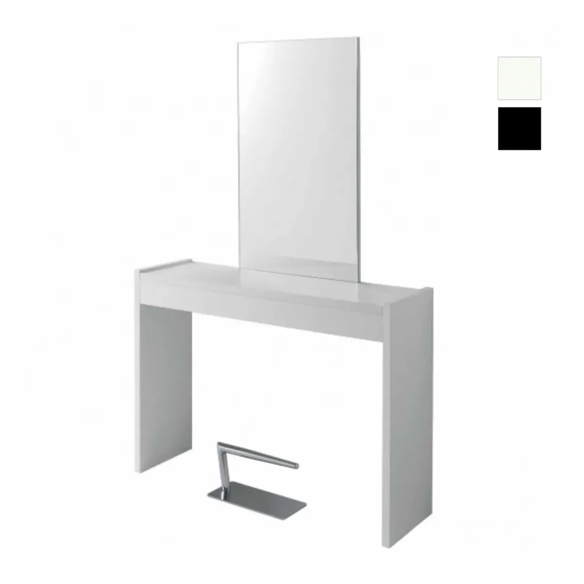 Specchio da Parrucchiere Professionale con ampio piano di lavoro in legno nobilitato con finiture a scelta tra quelle in foto, sulla struttura è presente uno specchio rettangolare dalle linee semplici ed essenziali. La postazione viene disposta a parete ed è incluso un poggiapiedi per parrucchieri in acciaio.