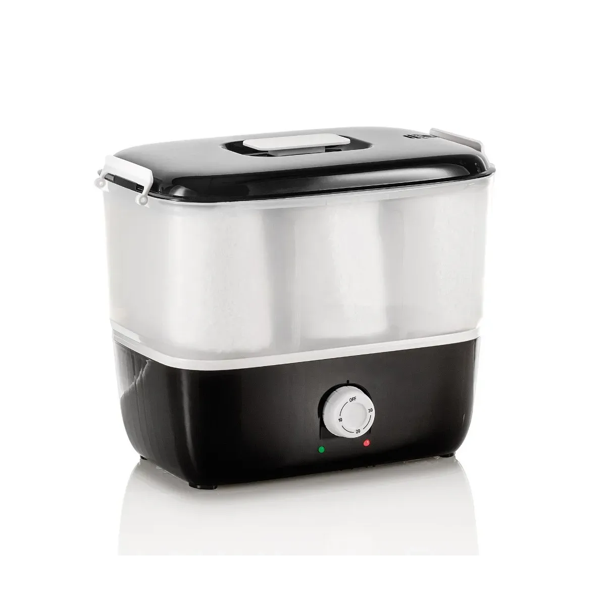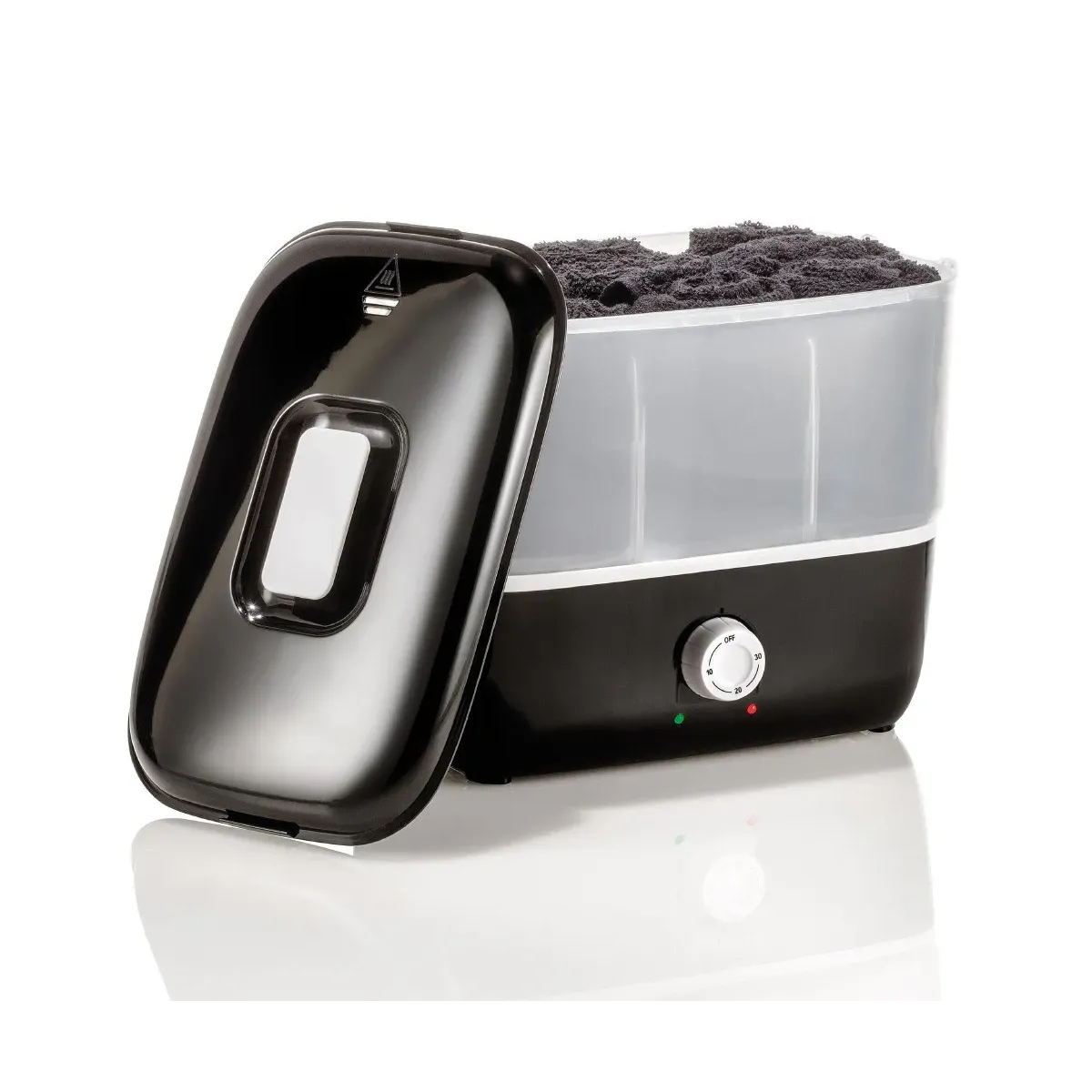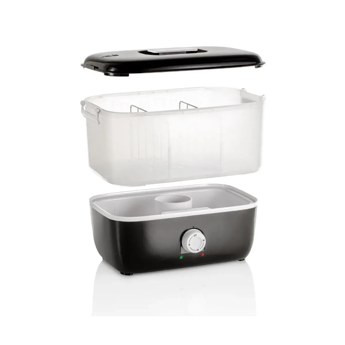 Il timer regolabile frontale permette di personalizzare la durata del riscaldamento fino a 30 minuti, mentre i due indicatori LED (verde e rosso) segnalano chiaramente lo stato di funzionamento. Il design leggero e compatto lo rende perfetto per essere posizionato su qualsiasi piano di lavoro, anche in spazi ridotti.