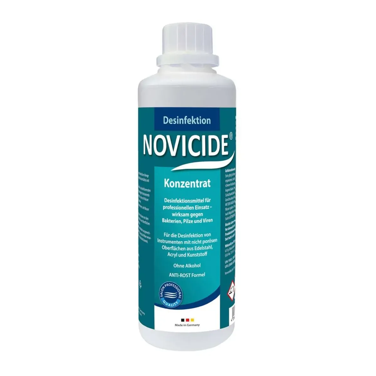 Novicide concentrato con azione contro virus, funghi e batteri ed azione antiruggine per attrezzi in metallo o plastica dei saloni per parrucchieri, saloni per barbieri, centri estetici e strutture sanitarie. Azione battericida, virucida, funghicida. Igienizzazione sicura ed efficace delle superfici acriliche (solarium), in acciaio inox, plastica, pettini, spazzole, rulli, forbici e strumenti per manicure. Speciale formula con protezione antiruggine.