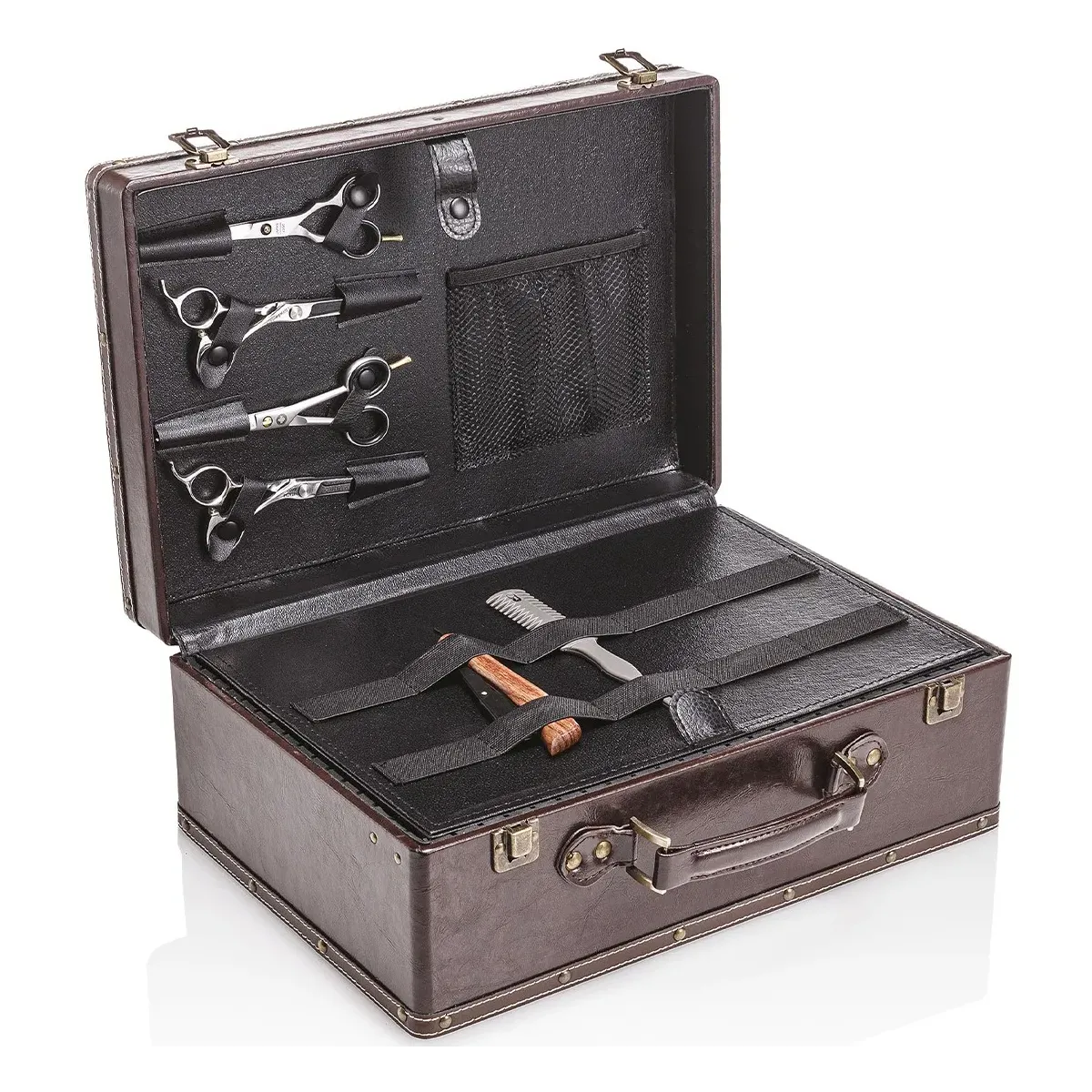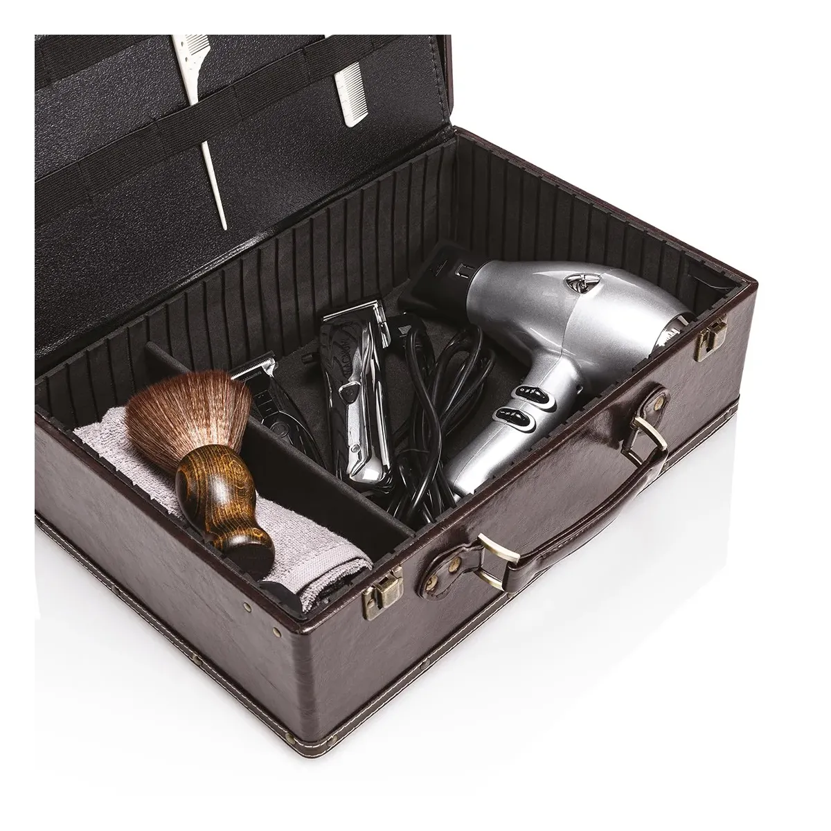 La valigia da barbiere è in struttura rigida di colore marrone, molto spaziosa in quanto presenta sul fondo due scomparti richiudibili tramite un pannello con la presenza di astucci per le tue forbici per capelli, pettini, rasoi da barba, tagliacapelli e asciugacapelli.