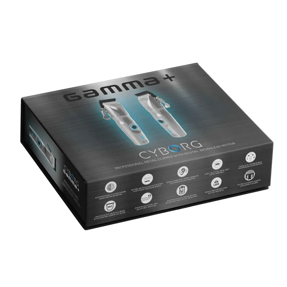 Gamma Piu CYBORG tagliacapelli con un corpo in metallo ultra-resistente e un’anima tecnologica Contiene una Lama Faper da 45 mm con lama mobile Slim Deep in Black Diamond Carbon ad alta scorrevolezza. Motore Digitale da 7.500 giri al minuto che genera una coppia elevata garantendo basse vibrazioni e una minore rumorosità.